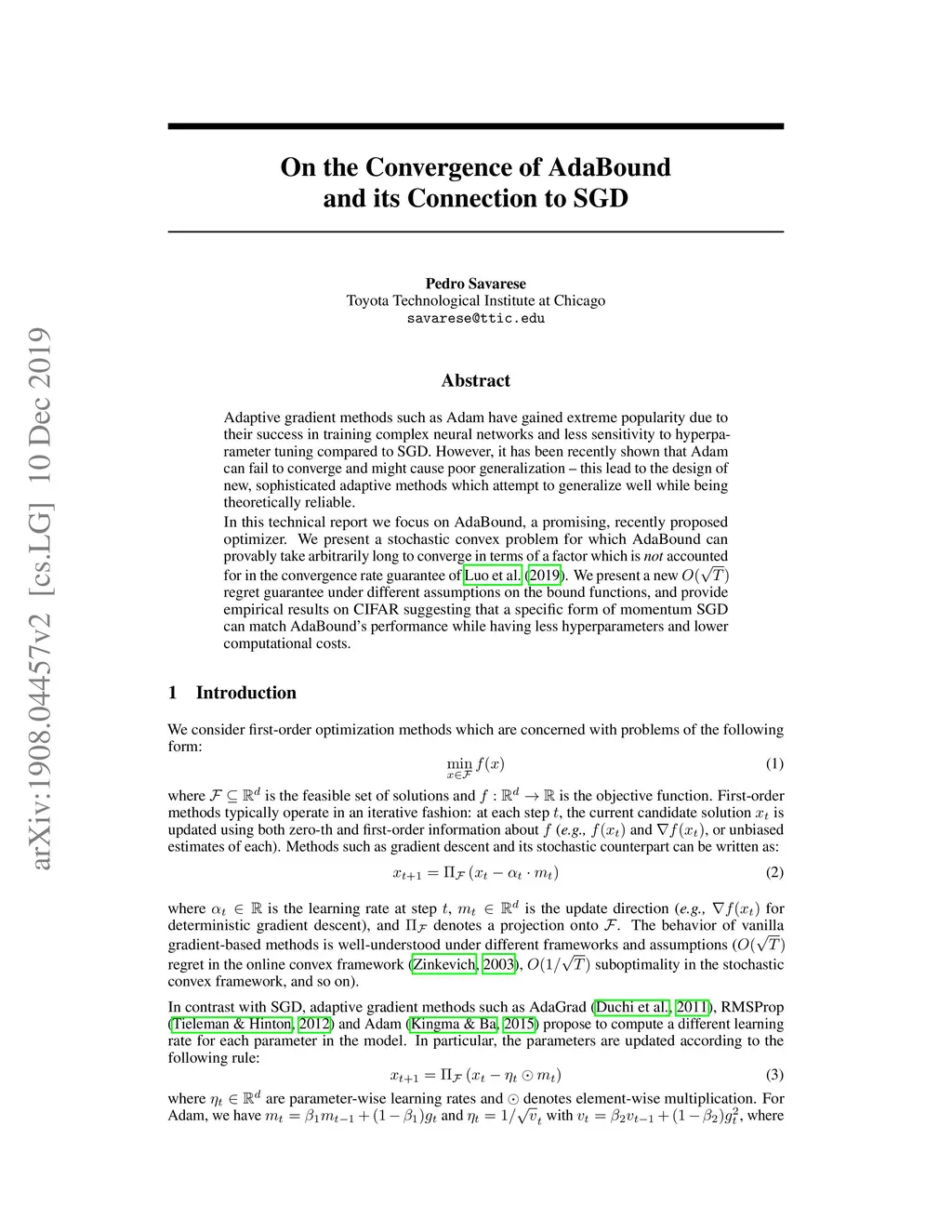 On the Convergence of AdaBound and its Connection to SGD