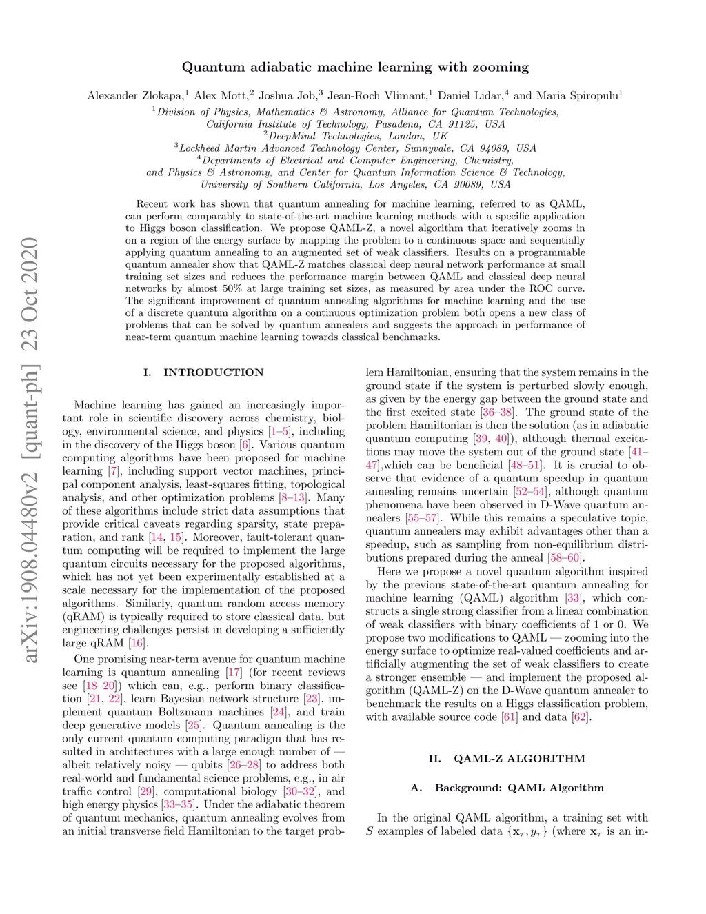 Recent work has shown that quantum annealing for machine learning, referred to as QAML, can perform comparably to state-of-the-art machine learning methods with a specific application to Higgs boson classification. We propose QAML-Z, a novel algorithm that iteratively zooms in on a region of the energy surface by mapping the problem to a continuous space and sequentially applying quantum annealing to an augmented set of weak classifiers. Results on a programmable quantum annealer show that QAML-Z matches classical deep neural network performance at small training set sizes and reduces the performance margin between QAML and classical deep neural networks by almost 50% at large training set sizes, as measured by area under the ROC curve. The significant improvement of quantum annealing algorithms for machine learning and the use of a discrete quantum algorithm on a continuous optimization problem both opens a new class of problems that can be solved by quantum annealers and suggests the approach in performance of near-term quantum machine learning towards classical benchmarks.