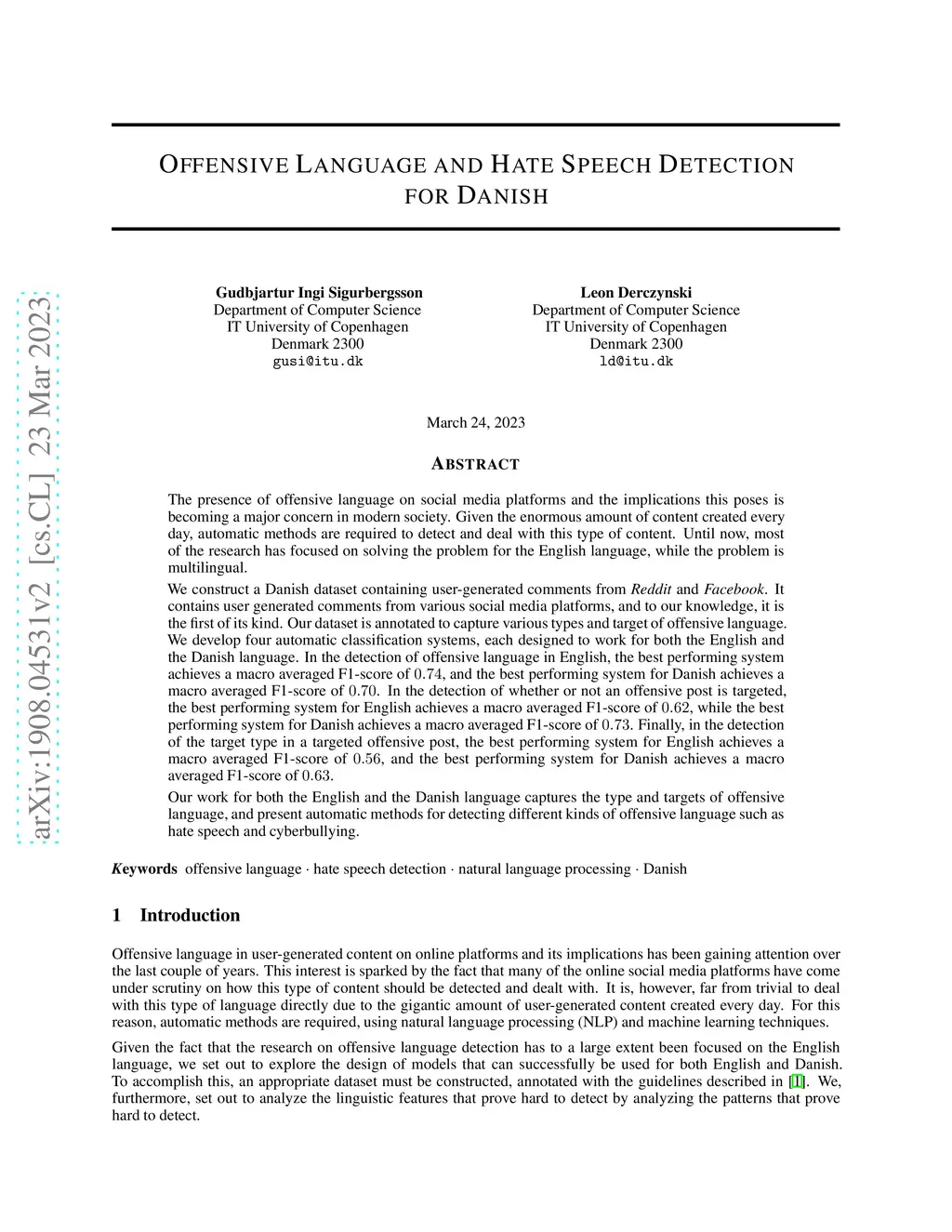 Offensive Language and Hate Speech Detection for Danish