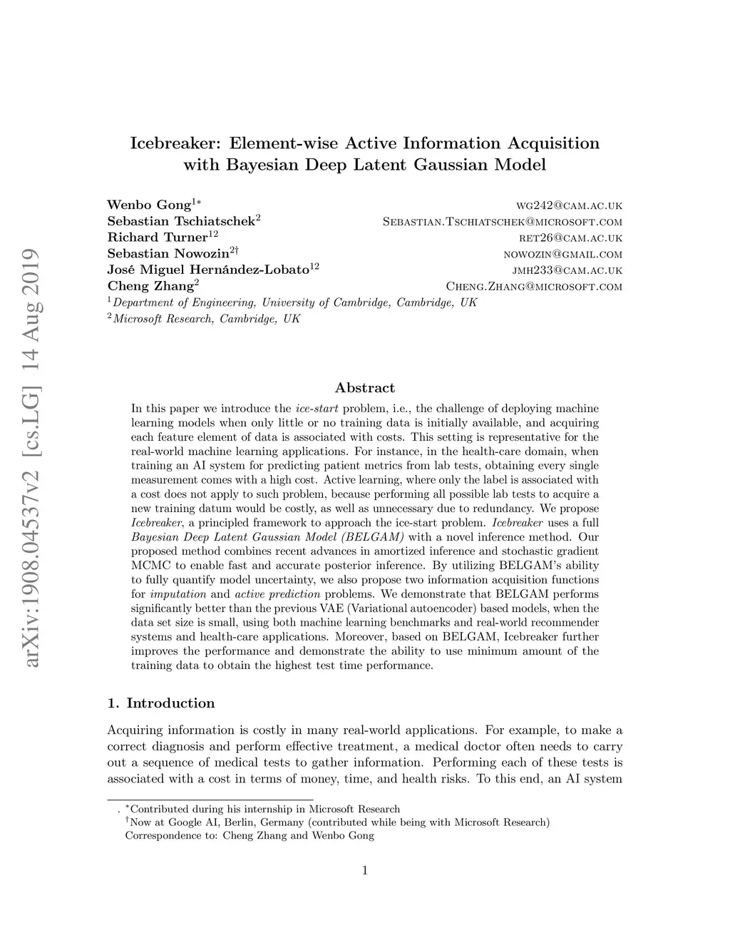 In this paper we introduce the ice-start problem, i.e., the challenge of deploying machine learning models when only little or no training data is initially available, and acquiring each feature element of data is associated with costs. This setting is representative for the real-world machine learning applications. For instance, in the health-care domain, when training an AI system for predicting patient metrics from lab tests, obtaining every single measurement comes with a high cost. Active learning, where only the label is associated with a cost does not apply to such problem, because performing all possible lab tests to acquire a new training datum would be costly, as well as unnecessary due to redundancy. We propose Icebreaker, a principled framework to approach the ice-start problem. Icebreaker uses a full Bayesian Deep Latent Gaussian Model (BELGAM) with a novel inference method. Our proposed method combines recent advances in amortized inference and stochastic gradient MCMC to enable fast and accurate posterior inference. By utilizing BELGAM's ability to fully quantify model uncertainty, we also propose two information acquisition functions for imputation and active prediction problems. We demonstrate that BELGAM performs significantly better than the previous VAE (Variational autoencoder) based models, when the data set size is small, using both machine learning benchmarks and real-world recommender systems and health-care applications. Moreover, based on BELGAM, Icebreaker further improves the performance and demonstrate the ability to use minimum amount of the training data to obtain the highest test time performance.
