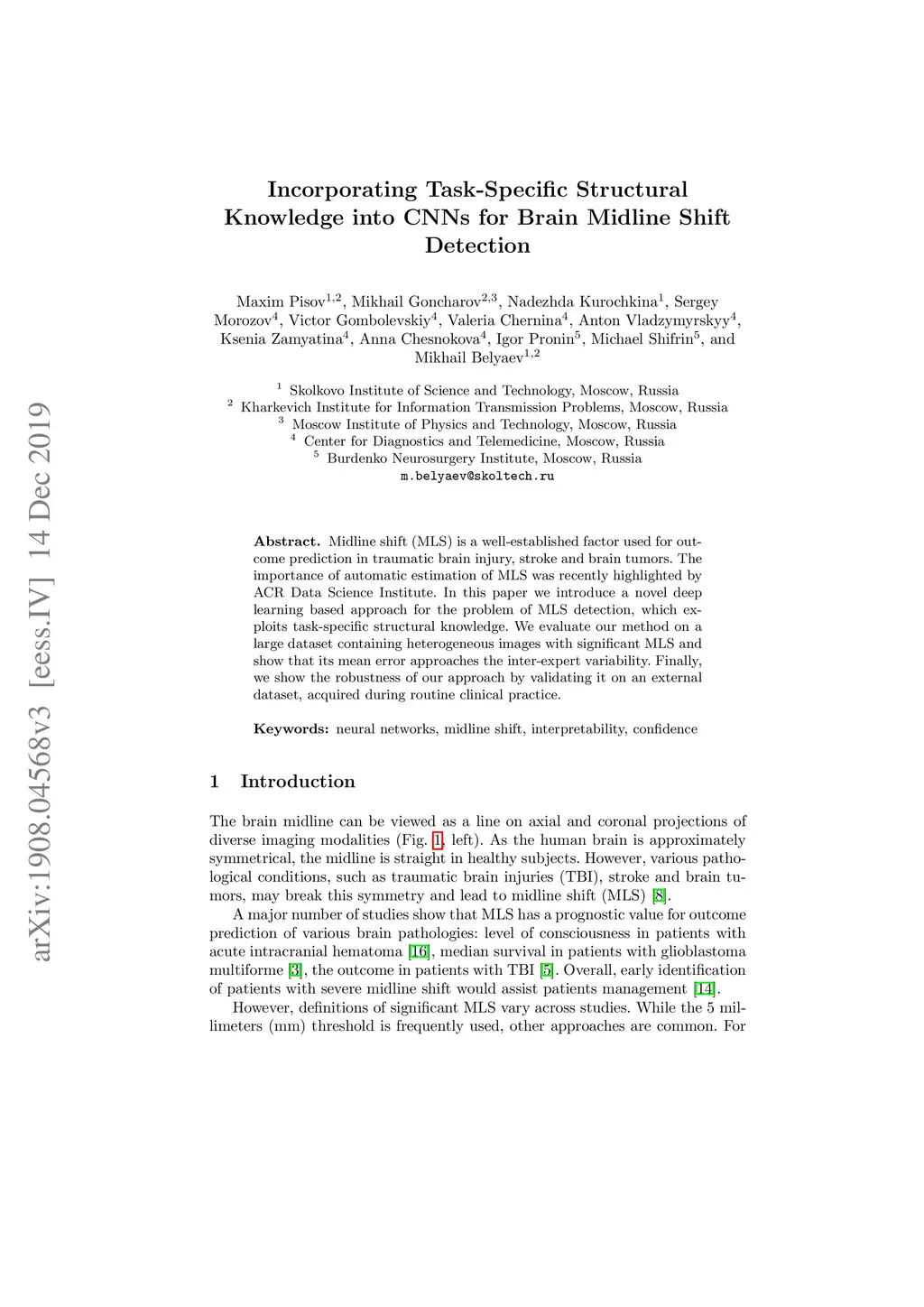 Midline shift (MLS) is a well-established factor used for outcome prediction in traumatic brain injury, stroke and brain tumors. The importance of automatic estimation of MLS was recently highlighted by ACR Data Science Institute. In this paper we introduce a novel deep learning based approach for the problem of MLS detection, which exploits task-specific structural knowledge. We evaluate our method on a large dataset containing heterogeneous images with significant MLS and show that its mean error approaches the inter-expert variability. Finally, we show the robustness of our approach by validating it on an external dataset, acquired during routine clinical practice.