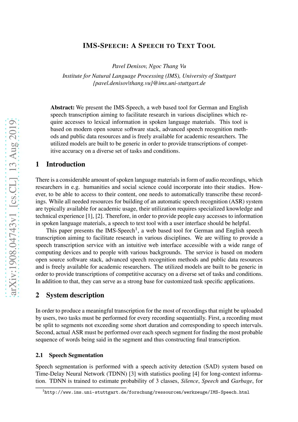 We present the IMS-Speech, a web based tool for German and English speech transcription aiming to facilitate research in various disciplines which require accesses to lexical information in spoken language materials. This tool is based on modern open source software stack, advanced speech recognition methods and public data resources and is freely available for academic researchers. The utilized models are built to be generic in order to provide transcriptions of competitive accuracy on a diverse set of tasks and conditions.