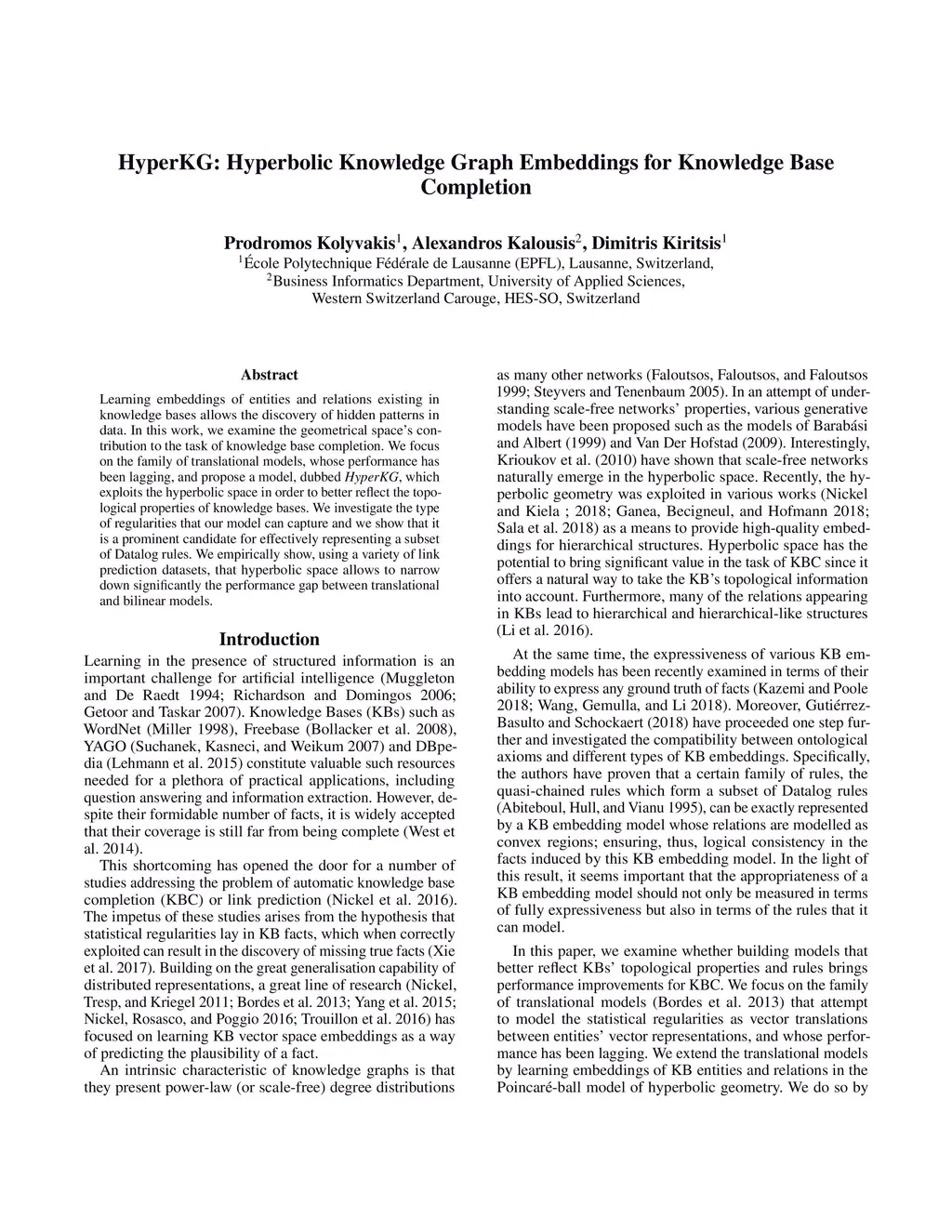 Learning embeddings of entities and relations existing in knowledge bases allows the discovery of hidden patterns in data. In this work, we examine the geometrical space's contribution to the task of knowledge base completion. We focus on the family of translational models, whose performance has been lagging, and propose a model, dubbed HyperKG, which exploits the hyperbolic space in order to better reflect the topological properties of knowledge bases. We investigate the type of regularities that our model can capture and we show that it is a prominent candidate for effectively representing a subset of Datalog rules. We empirically show, using a variety of link prediction datasets, that hyperbolic space allows to narrow down significantly the performance gap between translational and bilinear models.