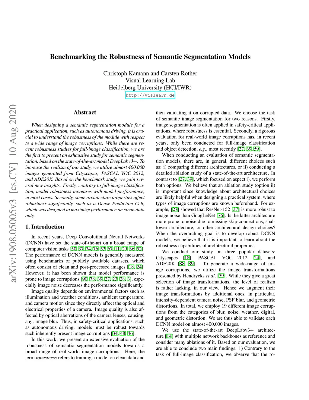 When designing a semantic segmentation module for a practical application, such as autonomous driving, it is crucial to understand the robustness of the module with respect to a wide range of image corruptions. While there are recent robustness studies for full-image classification, we are the first to present an exhaustive study for semantic segmentation, based on the state-of-the-art model DeepLabv3+. To increase the realism of our study, we utilize almost 400,000 images generated from Cityscapes, PASCAL VOC 2012, and ADE20K. Based on the benchmark study, we gain several new insights. Firstly, contrary to full-image classification, model robustness increases with model performance, in most cases. Secondly, some architecture properties affect robustness significantly, such as a Dense Prediction Cell, which was designed to maximize performance on clean data only.