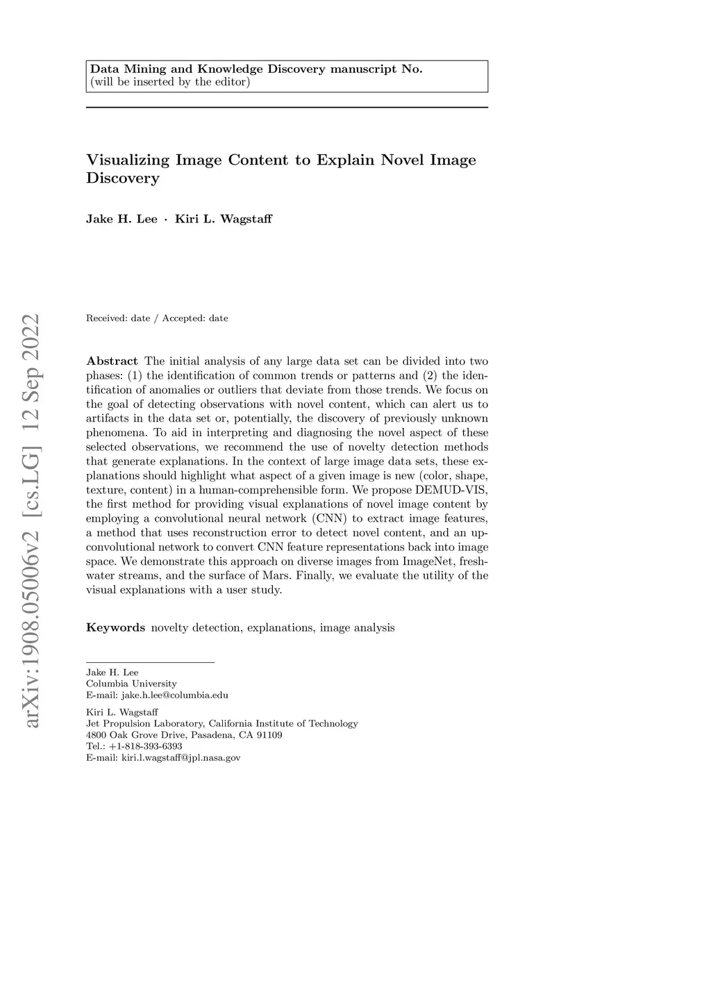 The initial analysis of any large data set can be divided into two phases: (1) the identification of common trends or patterns and (2) the identification of anomalies or outliers that deviate from those trends. We focus on the goal of detecting observations with novel content, which can alert us to artifacts in the data set or, potentially, the discovery of previously unknown phenomena. To aid in interpreting and diagnosing the novel aspect of these selected observations, we recommend the use of novelty detection methods that generate explanations. In the context of large image data sets, these explanations should highlight what aspect of a given image is new (color, shape, texture, content) in a human-comprehensible form. We propose DEMUD-VIS, the first method for providing visual explanations of novel image content by employing a convolutional neural network (CNN) to extract image features, a method that uses reconstruction error to detect novel content, and an up-convolutional network to convert CNN feature representations back into image space. We demonstrate this approach on diverse images from ImageNet, freshwater streams, and the surface of Mars.