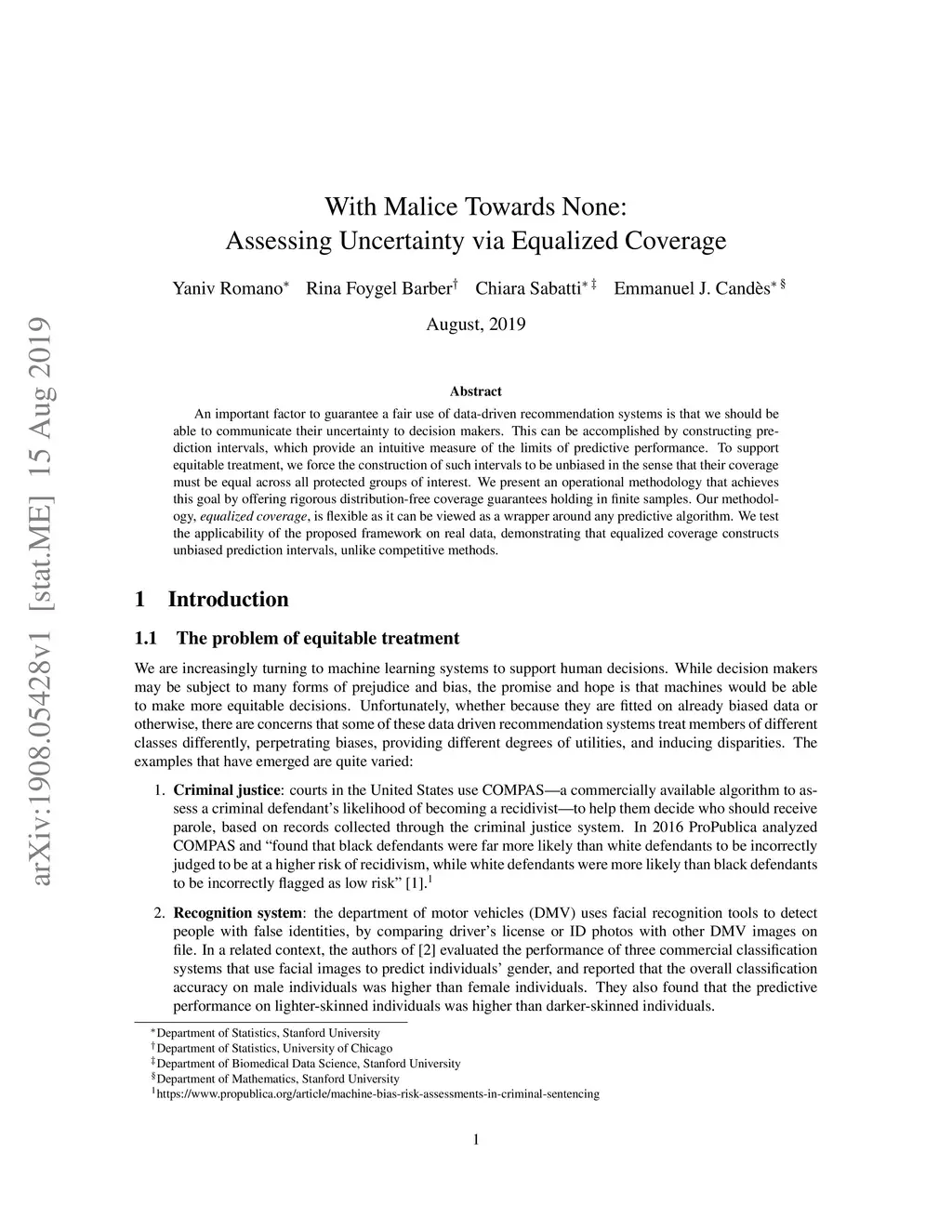 An important factor to guarantee a fair use of data-driven recommendation systems is that we should be able to communicate their uncertainty to decision makers. This can be accomplished by constructing prediction intervals, which provide an intuitive measure of the limits of predictive performance. To support equitable treatment, we force the construction of such intervals to be unbiased in the sense that their coverage must be equal across all protected groups of interest. We present an operational methodology that achieves this goal by offering rigorous distribution-free coverage guarantees holding in finite samples. Our methodology, equalized coverage, is flexible as it can be viewed as a wrapper around any predictive algorithm. We test the applicability of the proposed framework on real data, demonstrating that equalized coverage constructs unbiased prediction intervals, unlike competitive methods.