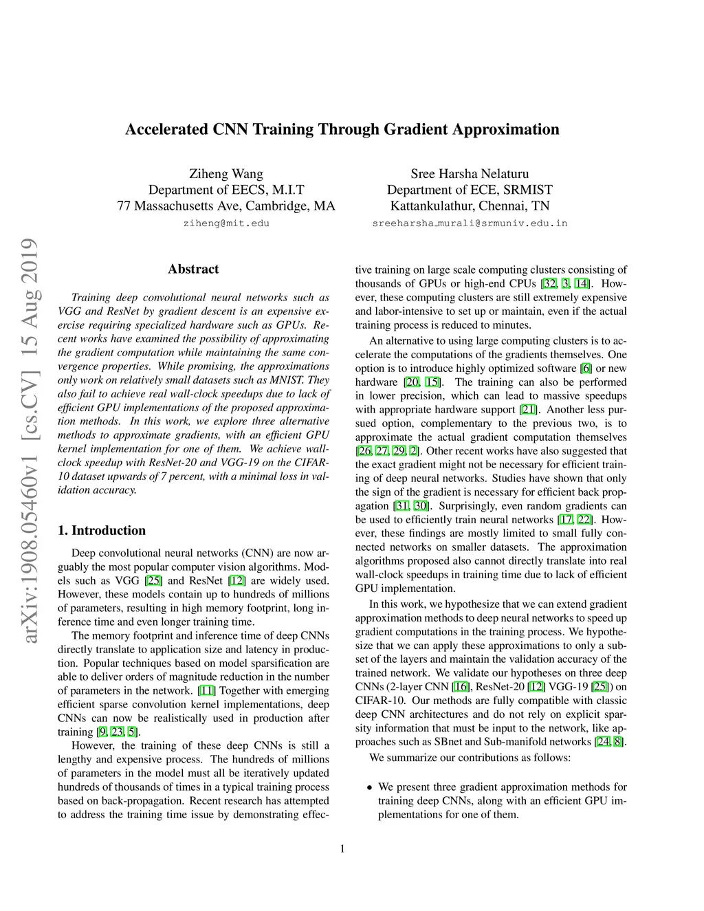 Training deep convolutional neural networks such as VGG and ResNet by gradient descent is an expensive exercise requiring specialized hardware such as GPUs. Recent works have examined the possibility of approximating the gradient computation while maintaining the same convergence properties. While promising, the approximations only work on relatively small datasets such as MNIST. They also fail to achieve real wall-clock speedups due to lack of efficient GPU implementations of the proposed approximation methods. In this work, we explore three alternative methods to approximate gradients, with an efficient GPU kernel implementation for one of them. We achieve wall-clock speedup with ResNet-20 and VGG-19 on the CIFAR-10 dataset upwards of 7%, with a minimal loss in validation accuracy.