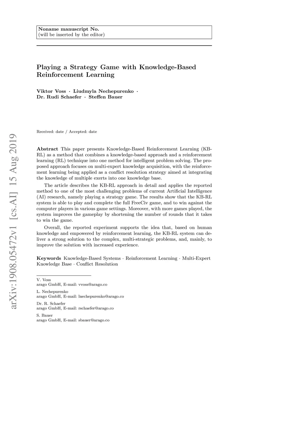 This paper presents Knowledge-Based Reinforcement Learning (KB-RL) as a method that combines a knowledge-based approach and a reinforcement learning (RL) technique into one method for intelligent problem solving. The proposed approach focuses on multi-expert knowledge acquisition, with the reinforcement learning being applied as a conflict resolution strategy aimed at integrating the knowledge of multiple exerts into one knowledge base. The article describes the KB-RL approach in detail and applies the reported method to one of the most challenging problems of current Artificial Intelligence (AI) research, namely playing a strategy game. The results show that the KB-RL system is able to play and complete the full FreeCiv game, and to win against the computer players in various game settings. Moreover, with more games played, the system improves the gameplay by shortening the number of rounds that it takes to win the game. Overall, the reported experiment supports the idea that, based on human knowledge and empowered by reinforcement learning, the KB-RL system can deliver a strong solution to the complex, multi-strategic problems, and, mainly, to improve the solution with increased experience.