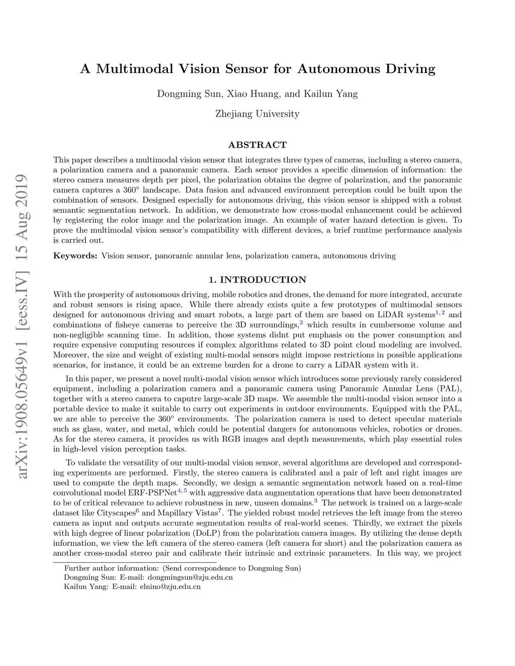 This paper describes a multimodal vision sensor that integrates three types of cameras, including a stereo camera, a polarization camera and a panoramic camera. Each sensor provides a specific dimension of information: the stereo camera measures depth per pixel, the polarization obtains the degree of polarization, and the panoramic camera captures a 360-degree landscape. Data fusion and advanced environment perception could be built upon the combination of sensors. Designed especially for autonomous driving, this vision sensor is shipped with a robust semantic segmentation network. In addition, we demonstrate how cross-modal enhancement could be achieved by registering the color image and the polarization image. An example of water hazard detection is given. To prove the multimodal vision sensor's compatibility with different devices, a brief runtime performance analysis is carried out.
