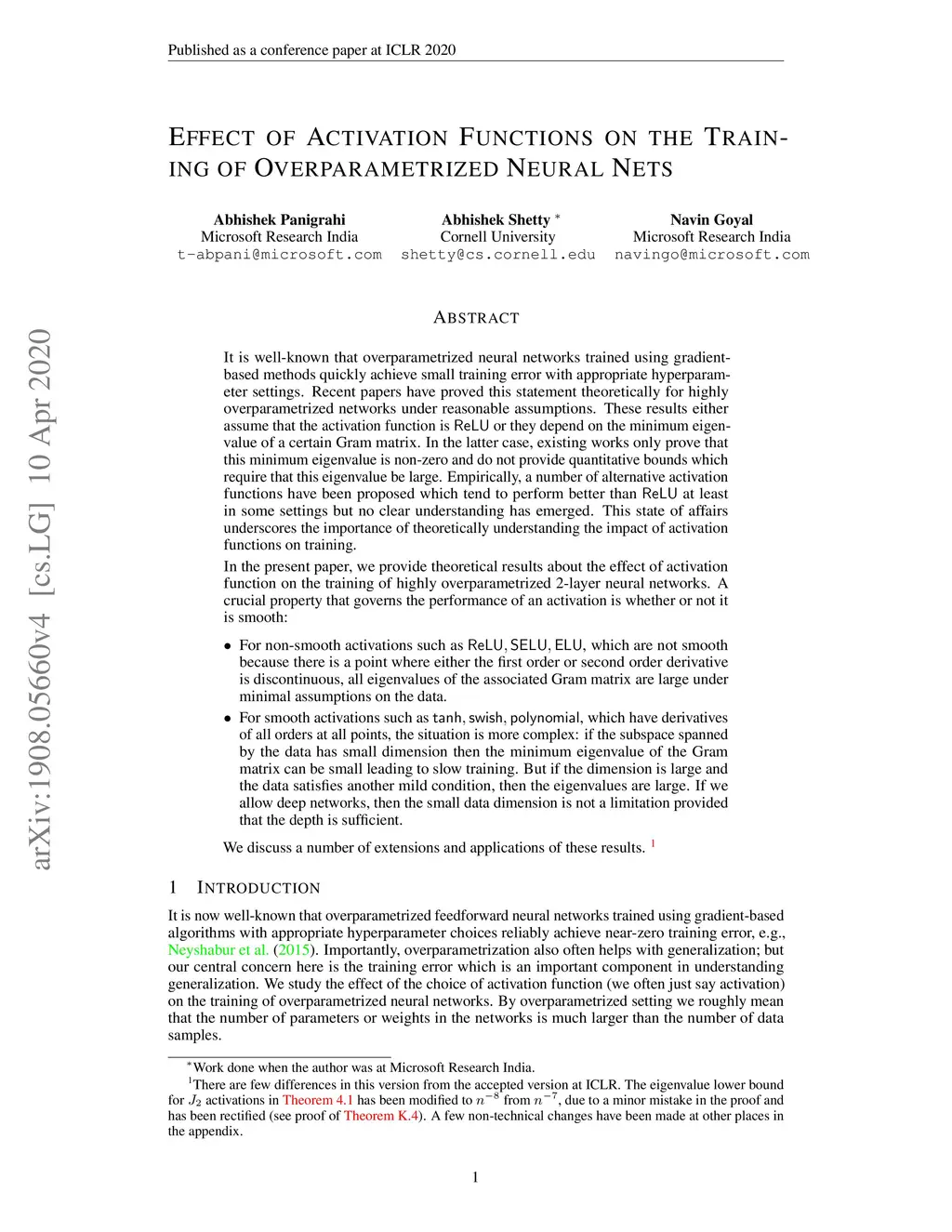 It is well-known that overparametrized neural networks trained using gradient-based methods quickly achieve small training error with appropriate hyperparameter settings. Recent papers have proved this statement theoretically for highly overparametrized networks under reasonable assumptions. These results either assume that the activation function is ReLU or they crucially depend on the minimum eigenvalue of a certain Gram matrix depending on the data, random initialization and the activation function. In the later case, existing works only prove that this minimum eigenvalue is non-zero and do not provide quantitative bounds. On the empirical side, a contemporary line of investigations has proposed a number of alternative activation functions which tend to perform better than ReLU at least in some settings but no clear understanding has emerged. This state of affairs underscores the importance of theoretically understanding the impact of activation functions on training. In the present paper, we provide theoretical results about the effect of activation function on the training of highly overparametrized 2-layer neural networks. A crucial property that governs the performance of an activation is whether or not it is smooth. For non-smooth activations such as ReLU, SELU and ELU, all eigenvalues of the associated Gram matrix are large under minimal assumptions on the data. For smooth activations such as tanh, swish and polynomials, the situation is more complex. If the subspace spanned by the data has small dimension then the minimum eigenvalue of the Gram matrix can be small leading to slow training. But if the dimension is large and the data satisfies another mild condition, then the eigenvalues are large. If we allow deep networks, then the small data dimension is not a limitation provided that the depth is sufficient. We discuss a number of extensions and applications of these results.