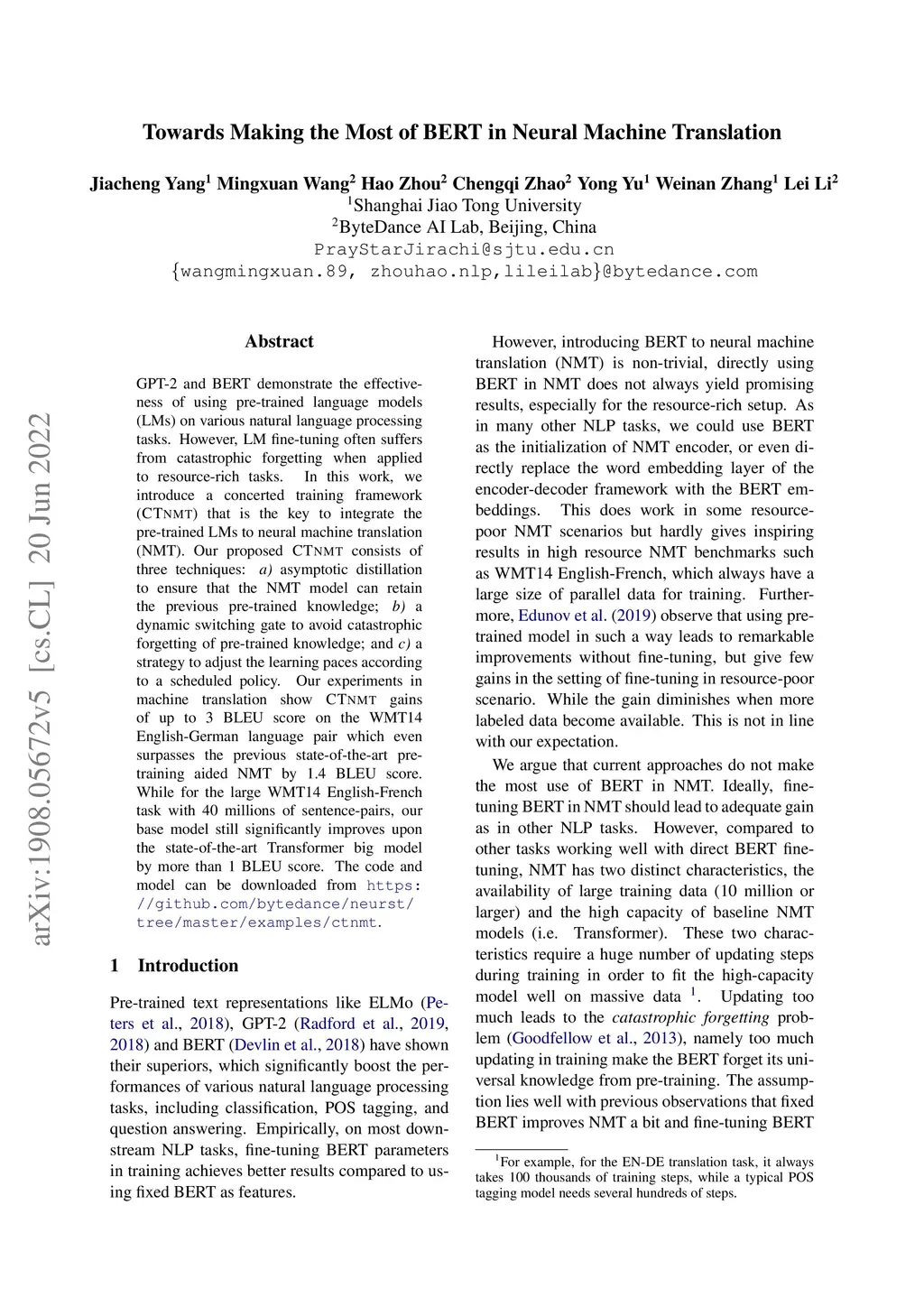 GPT-2 and BERT demonstrate the effectiveness of using pre-trained language models (LMs) on various natural language processing tasks. However, LM fine-tuning often suffers from catastrophic forgetting when applied to resource-rich tasks. In this work, we introduce a concerted training framework (CTNMT) that is the key to integrate the pre-trained LMs to neural machine translation (NMT). Our proposed CTNMT consists of three techniques: a) asymptotic distillation to ensure that the NMT model can retain the previous pre-trained knowledge; b) a dynamic switching gate to avoid catastrophic forgetting of pre-trained knowledge; and c) a strategy to adjust the learning paces according to a scheduled policy. Our experiments in machine translation show CTNMT gains of up to 3 BLEU score on the WMT14 English-German language pair which even surpasses the previous state-of-the-art pre-training aided NMT by 1.4 BLEU score. While for the large WMT14 English-French task with 40 millions of sentence-pairs, our base model still significantly improves upon the state-of-the-art Transformer big model by more than 1 BLEU score. The code and model can be downloaded from https://github.com/bytedance/neurst/ tree/master/examples/ctnmt.