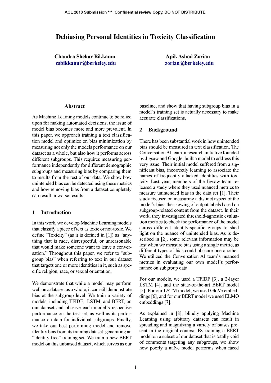 As Machine Learning models continue to be relied upon for making automated decisions, the issue of model bias becomes more and more prevalent. In this paper, we approach training a text classifica-tion model and optimize on bias minimization by measuring not only the models performance on our dataset as a whole, but also how it performs across different subgroups. This requires measuring per-formance independently for different demographic subgroups and measuring bias by comparing them to results from the rest of our data. We show how unintended bias can be detected using these metrics and how removing bias from a dataset completely can result in worse results.