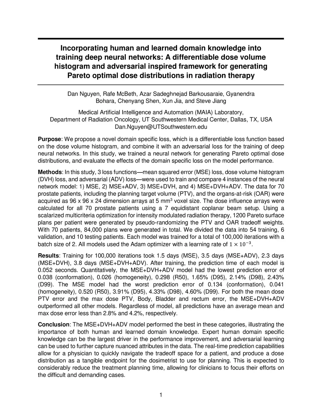We propose a novel domain specific loss, which is a differentiable loss function based on the dose volume histogram, and combine it with an adversarial loss for the training of deep neural networks to generate Pareto optimal dose distributions. The mean squared error (MSE) loss, dose volume histogram (DVH) loss, and adversarial (ADV) loss were used to train 4 instances of the neural network model: 1) MSE, 2) MSE+ADV, 3) MSE+DVH, and 4) MSE+DVH+ADV. 70 prostate patients were acquired, and the dose influence arrays were calculated for each patient. 1200 Pareto surface plans per patient were generated by pseudo-randomizing the tradeoff weights (84,000 plans total). We divided the data into 54 training, 6 validation, and 10 testing patients. Each model was trained for 100,000 iterations, with a batch size of 2. The prediction time of each model is 0.052 seconds. Quantitatively, the MSE+DVH+ADV model had the lowest prediction error of 0.038 (conformation), 0.026 (homogeneity), 0.298 (R50), 1.65% (D95), 2.14% (D98), 2.43% (D99). The MSE model had the worst prediction error of 0.134 (conformation), 0.041 (homogeneity), 0.520 (R50), 3.91% (D95), 4.33% (D98), 4.60% (D99). For both the mean dose PTV error and the max dose PTV, Body, Bladder and rectum error, the MSE+DVH+ADV outperformed all other models. All model's predictions have an average mean and max dose error less than 2.8% and 4.2%, respectively. Expert human domain specific knowledge can be the largest driver in the performance improvement, and adversarial learning can be used to further capture nuanced features. The real-time prediction capabilities allow for a physician to quickly navigate the tradeoff space, and produce a dose distribution as a tangible endpoint for the dosimetrist to use for planning. This can considerably reduce the treatment planning time, allowing for clinicians to focus their efforts on challenging cases.