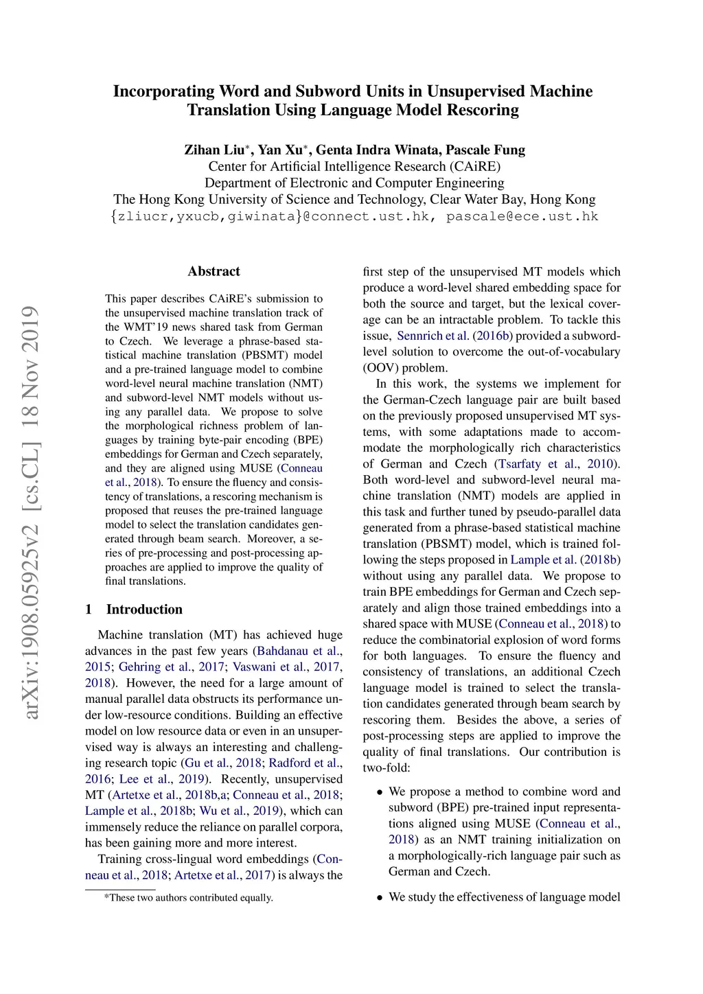 This paper describes CAiRE's submission to the unsupervised machine translation track of the WMT'19 news shared task from German to Czech. We leverage a phrase-based statistical machine translation (PBSMT) model and a pre-trained language model to combine word-level neural machine translation (NMT) and subword-level NMT models without using any parallel data. We propose to solve the morphological richness problem of languages by training byte-pair encoding (BPE) embeddings for German and Czech separately, and they are aligned using MUSE (Conneau et al., 2018). To ensure the fluency and consistency of translations, a rescoring mechanism is proposed that reuses the pre-trained language model to select the translation candidates generated through beam search. Moreover, a series of pre-processing and post-processing approaches are applied to improve the quality of final translations.