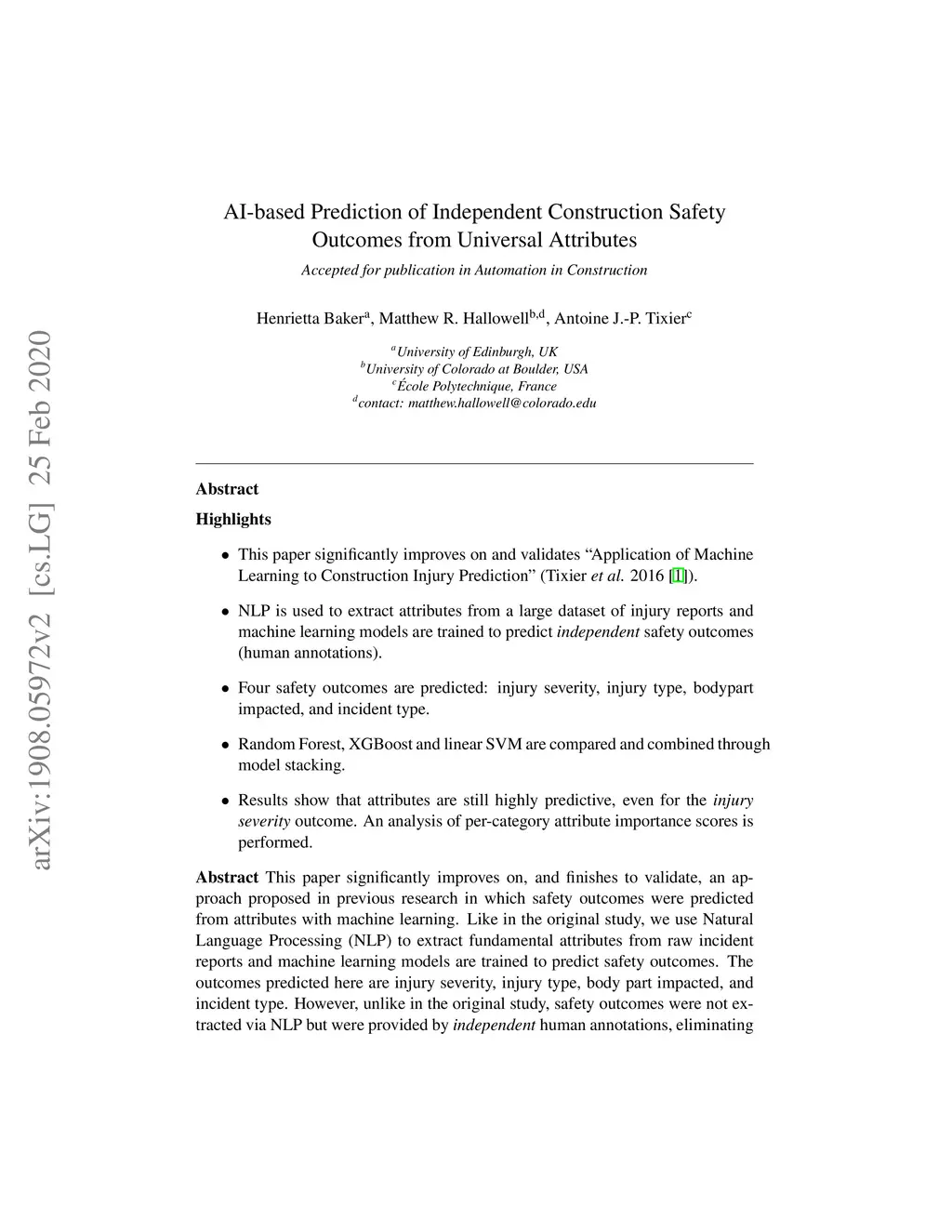 AI-based Prediction of Independent Construction Safety Outcomes from
