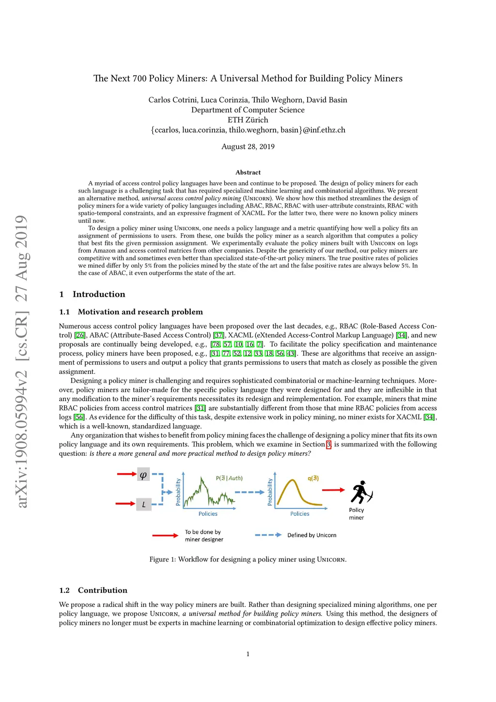 A myriad of access control policy languages have been and continue to be proposed. The design of policy miners for each such language is a challenging task that has required specialized machine learning and combinatorial algorithms. We present an alternative method, universal access control policy mining (Unicorn). We show how this method streamlines the design of policy miners for a wide variety of policy languages including ABAC, RBAC, RBAC with user-attribute constraints, RBAC with spatio-temporal constraints, and an expressive fragment of XACML. For the latter two, there were no known policy miners until now. To design a policy miner using Unicorn, one needs a policy language and a metric quantifying how well a policy fits an assignment of permissions to users. From these, one builds the policy miner as a search algorithm that computes a policy that best fits the given permission assignment. We experimentally evaluate the policy miners built with Unicorn on logs from Amazon and access control matrices from other companies. Despite the genericity of our method, our policy miners are competitive with and sometimes even better than specialized state-of-the-art policy miners. The true positive rates of policies we mined differ by only 5% from the policies mined by the state of the art and the false positive rates are always below 5%. In the case of ABAC, it even outperforms the state of the art.