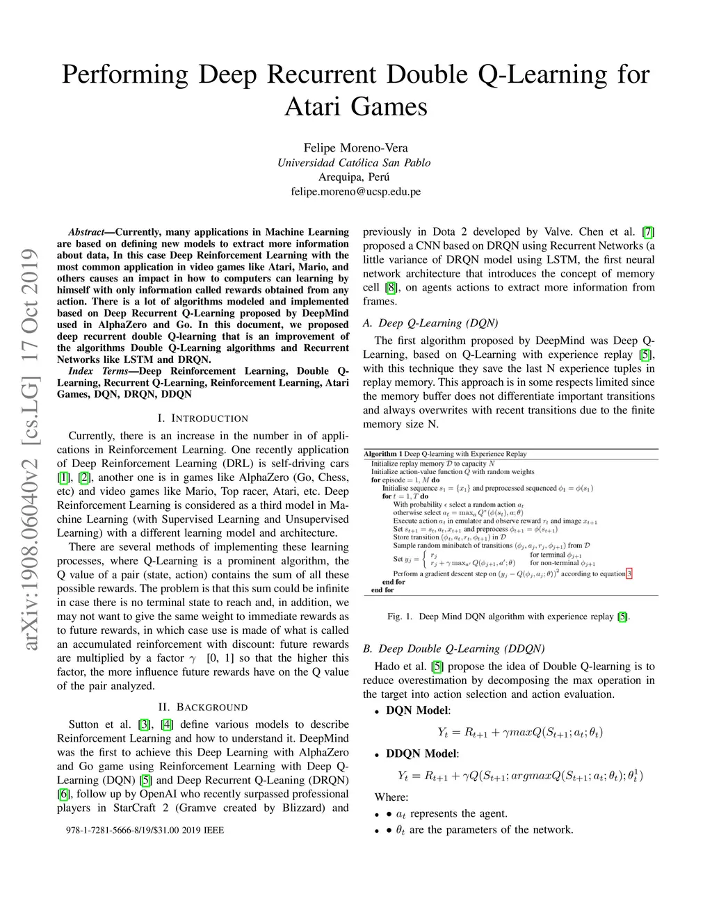 Currently, many applications in Machine Learning are based on define new models to extract more information about data, In this case Deep Reinforcement Learning with the most common application in video games like Atari, Mario, and others causes an impact in how to computers can learning by himself with only information called rewards obtained from any action. There is a lot of algorithms modeled and implemented based on Deep Recurrent Q-Learning proposed by DeepMind used in AlphaZero and Go. In this document, We proposed Deep Recurrent Double Q-Learning that is an implementation of Deep Reinforcement Learning using Double Q-Learning algorithms and Recurrent Networks like LSTM and DRQN.