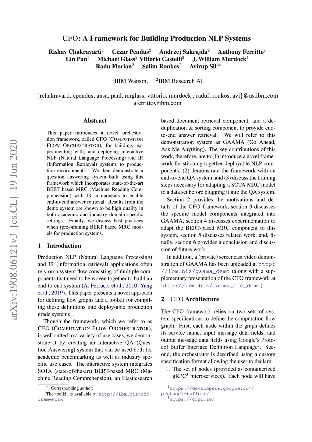 This paper introduces a novel orchestration framework, called CFO (COMPUTATION FLOW ORCHESTRATOR), for building, experimenting with, and deploying interactive NLP (Natural Language Processing) and IR (Information Retrieval) systems to production environments. We then demonstrate a question answering system built using this framework which incorporates state-of-the-art BERT based MRC (Machine Reading Comprehension) with IR components to enable end-to-end answer retrieval. Results from the demo system are shown to be high quality in both academic and industry domain specific settings. Finally, we discuss best practices when (pre-)training BERT based MRC models for production systems.
