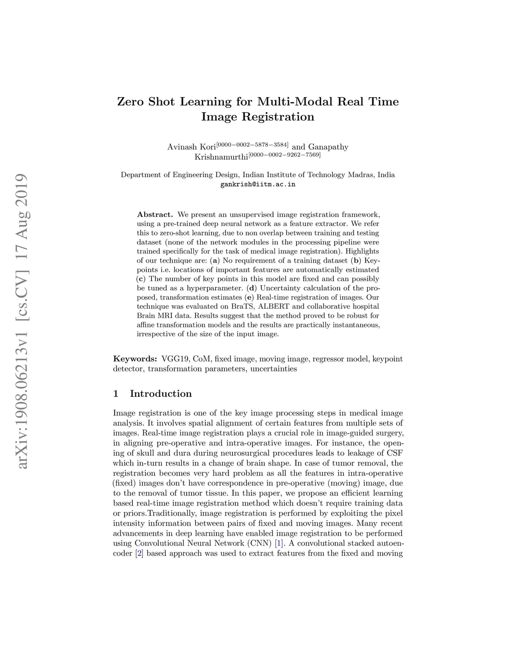 In this report we present an unsupervised image registration framework, using a pre-trained deep neural network as a feature extractor. We refer this to zero-shot learning, due to nonoverlap between training and testing dataset (none of the network modules in the processing pipeline were trained specifically for the task of medical image registration). Highlights of our technique are: (a) No requirement of a training dataset (b) Keypoints i.e.locations of important features are automatically estimated (c) The number of key points in this model is fixed and can possibly be tuned as a hyperparameter. (d) Uncertaintycalculation of the proposed, transformation estimates (e) Real-time registration of images. Our technique was evaluated on BraTS, ALBERT, and collaborative hospital Brain MRI data. Results suggest that the method proved to be robust for affine transformation models and the results are practically instantaneous, irrespective of the size of the input image