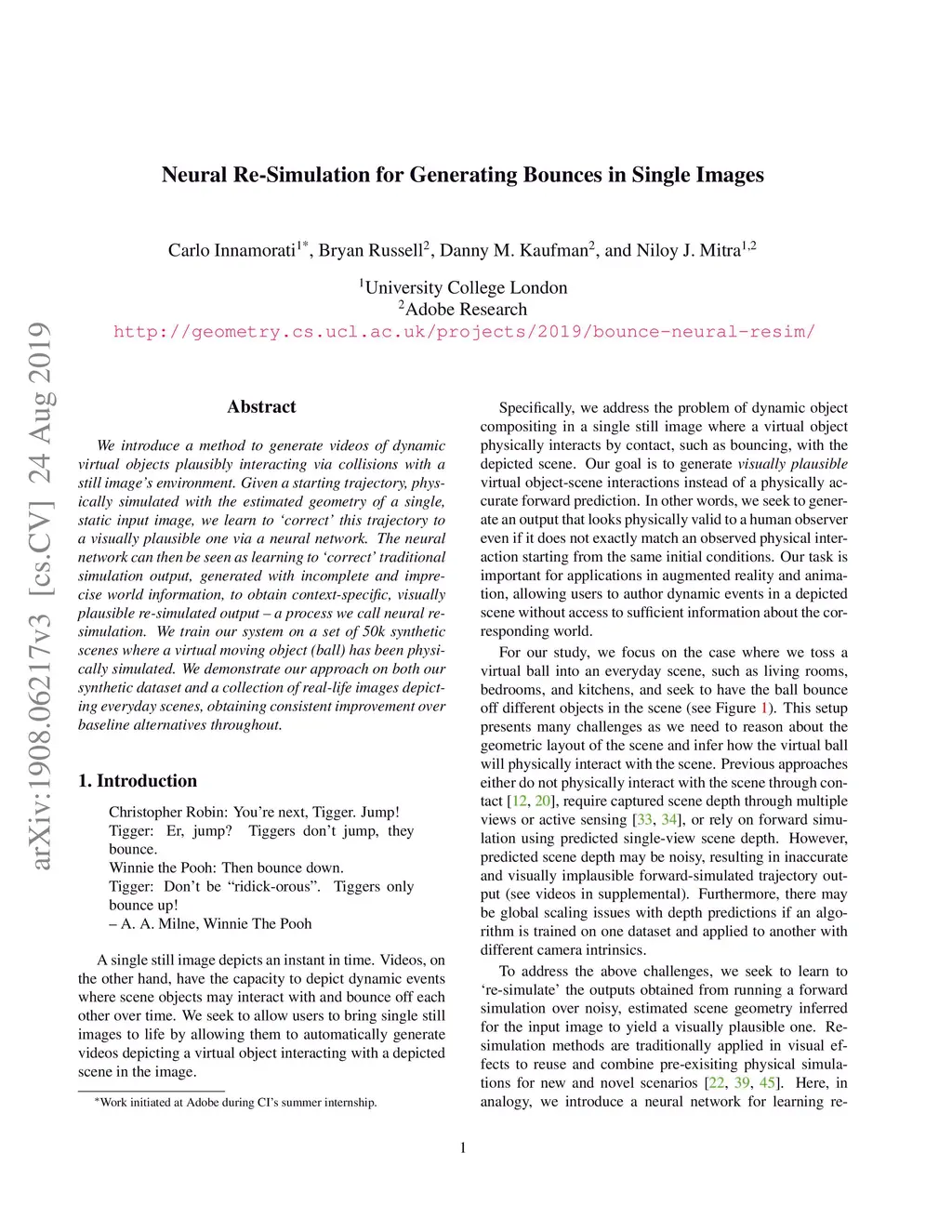 We introduce a method to generate videos of dynamic virtual objects plausibly interacting via collisions with a still image's environment. Given a starting trajectory, physically simulated with the estimated geometry of a single, static input image, we learn to 'correct' this trajectory to a visually plausible one via a neural network. The neural network can then be seen as learning to 'correct' traditional simulation output, generated with incomplete and imprecise world information, to obtain context-specific, visually plausible re-simulated output, a process we call neural re-simulation. We train our system on a set of 50k synthetic scenes where a virtual moving object (ball) has been physically simulated. We demonstrate our approach on both our synthetic dataset and a collection of real-life images depicting everyday scenes, obtaining consistent improvement over baseline alternatives throughout.