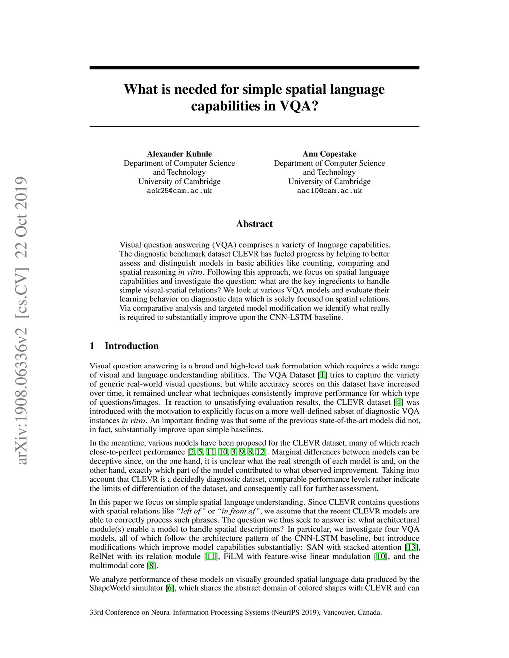 Visual question answering (VQA) comprises a variety of language capabilities. The diagnostic benchmark dataset CLEVR has fueled progress by helping to better assess and distinguish models in basic abilities like counting, comparing and spatial reasoning in vitro. Following this approach, we focus on spatial language capabilities and investigate the question: what are the key ingredients to handle simple visual-spatial relations? We look at the SAN, RelNet, FiLM and MC models and evaluate their learning behavior on diagnostic data which is solely focused on spatial relations. Via comparative analysis and targeted model modification we identify what really is required to substantially improve upon the CNN-LSTM baseline.
