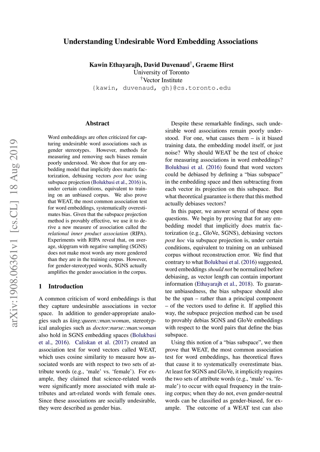 Word embeddings are often criticized for capturing undesirable word associations such as gender stereotypes. However, methods for measuring and removing such biases remain poorly understood. We show that for any embedding model that implicitly does matrix factorization, debiasing vectors post hoc using subspace projection (Bolukbasi et al., 2016) is, under certain conditions, equivalent to training on an unbiased corpus. We also prove that WEAT, the most common association test for word embeddings, systematically overestimates bias. Given that the subspace projection method is provably effective, we use it to derive a new measure of association called the (RIPA). Experiments with RIPA reveal that, on average, skipgram with negative sampling (SGNS) does not make most words any more gendered than they are in the training corpus. However, for gender-stereotyped words, SGNS actually amplifies the gender association in the corpus.