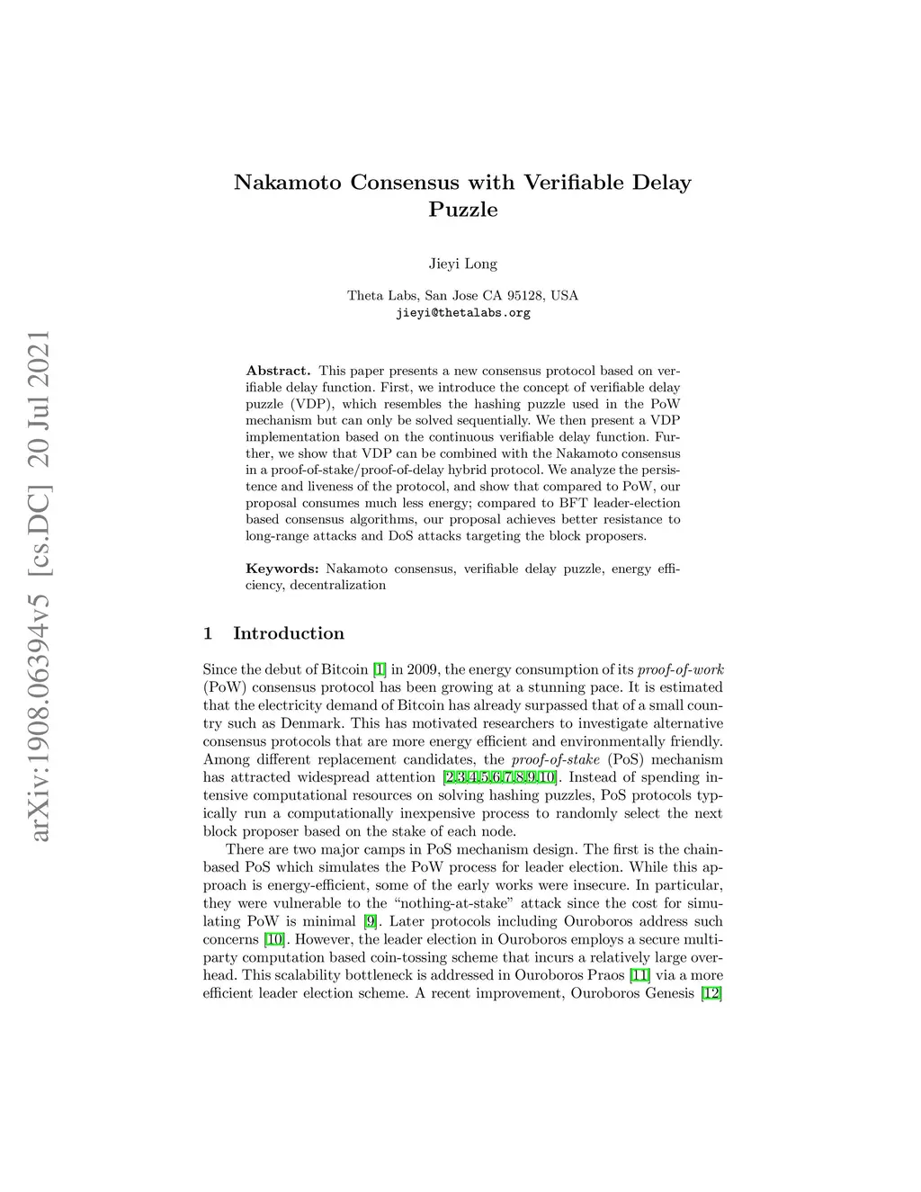 This paper presents a new consensus protocol based on verifiable delay function. First, we introduce the concept of verifiable delay puzzle (VDP), which resembles the hashing puzzle used in the PoW mechanism but can only be solved sequentially. We then present a VDP implementation based on the continuous verifiable delay function. Further, we show that VDP can be combined with the Nakamoto consensus in a proof-of-stake/proof-of-delay hybrid protocol. We analyze the persistence and liveness of the protocol, and show that compared to PoW, our proposal consumes much less energy; compared to BFT leader-election based consensus algorithms, our proposal achieves better resistance to long-range attacks and DoS attacks targeting the block proposers.