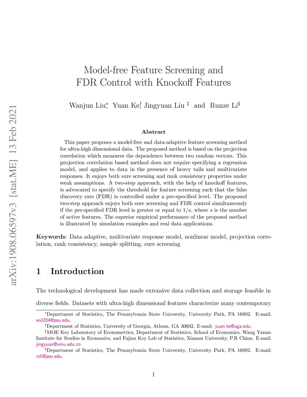 This paper proposes a model-free and data-adaptive feature screening method for ultra-high dimensional datasets. The proposed method is based on the projection correlation which measures the dependence between two random vectors. This projection correlation based method does not require specifying a regression model and applies to the data in the presence of heavy-tailed errors and multivariate response. It enjoys both sure screening and rank consistency properties under weak assumptions. Further, a two-step approach is proposed to control the false discovery rate (FDR) in feature screening with the help of knockoff features. It can be shown that the proposed two-step approach enjoys both sure screening and FDR control if the pre-specified FDR level is greater or equal to , where is the number of active features. The superior empirical performance of the proposed methods is justified by various numerical experiments and real data applications.