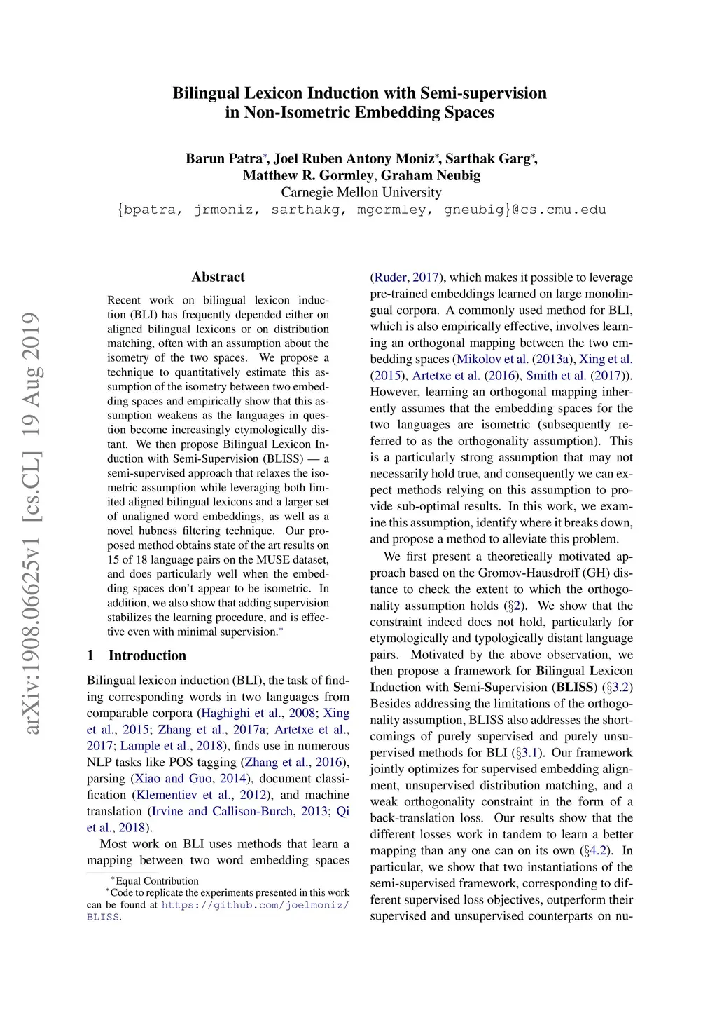 Recent work on bilingual lexicon induction (BLI) has frequently depended either on aligned bilingual lexicons or on distribution matching, often with an assumption about the isometry of the two spaces. We propose a technique to quantitatively estimate this assumption of the isometry between two embedding spaces and empirically show that this assumption weakens as the languages in question become increasingly etymologically distant. We then propose Bilingual Lexicon Induction with Semi-Supervision (BLISS) --- a semi-supervised approach that relaxes the isometric assumption while leveraging both limited aligned bilingual lexicons and a larger set of unaligned word embeddings, as well as a novel hubness filtering technique. Our proposed method obtains state of the art results on 15 of 18 language pairs on the MUSE dataset, and does particularly well when the embedding spaces don't appear to be isometric. In addition, we also show that adding supervision stabilizes the learning procedure, and is effective even with minimal supervision.