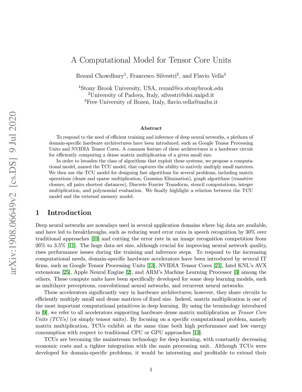 To respond to the need of efficient training and inference of deep neural networks, a plethora of domain-specific hardware architectures have been introduced, such as Google Tensor Processing Units and NVIDIA Tensor Cores. A common feature of these architectures is a hardware circuit for efficiently computing a dense matrix multiplication of a given small size. In order to broaden the class of algorithms that exploit these systems, we propose a computational model, named the TCU model, that captures the ability to natively multiply small matrices. We then use the TCU model for designing fast algorithms for several problems, including matrix operations (dense and sparse multiplication, Gaussian Elimination), graph algorithms (transitive closure, all pairs shortest distances), Discrete Fourier Transform, stencil computations, integer multiplication, and polynomial evaluation. We finally highlight a relation between the TCU model and the external memory model.