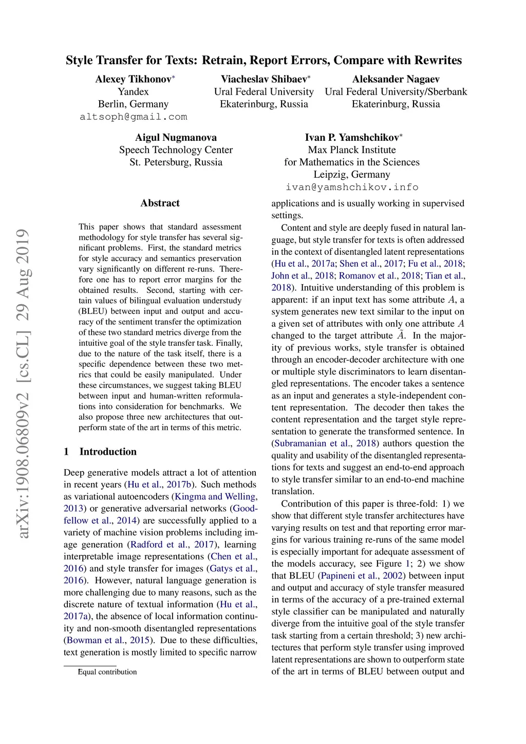 This paper shows that standard assessment methodology for style transfer has several significant problems. First, the standard metrics for style accuracy and semantics preservation vary significantly on different re-runs. Therefore one has to report error margins for the obtained results. Second, starting with certain values of bilingual evaluation understudy (BLEU) between input and output and accuracy of the sentiment transfer the optimization of these two standard metrics diverge from the intuitive goal of the style transfer task. Finally, due to the nature of the task itself, there is a specific dependence between these two metrics that could be easily manipulated. Under these circumstances, we suggest taking BLEU between input and human-written reformulations into consideration for benchmarks. We also propose three new architectures that outperform state of the art in terms of this metric.