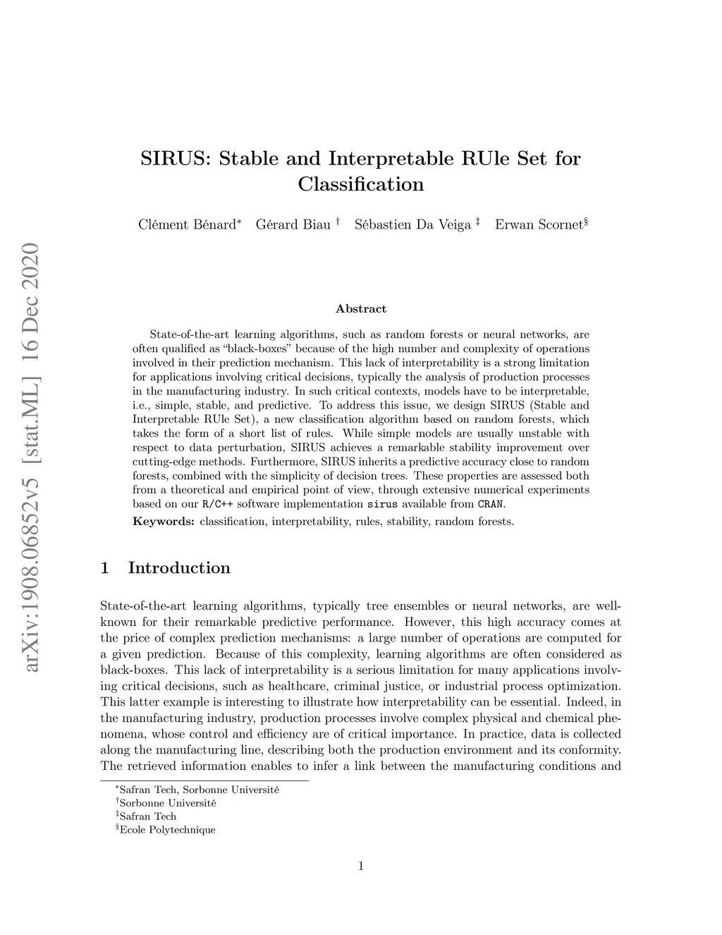 State-of-the-art learning algorithms, such as random forests or neural networks, are often qualified as "black-boxes" because of the high number and complexity of operations involved in their prediction mechanism. This lack of interpretability is a strong limitation for applications involving critical decisions, typically the analysis of production processes in the manufacturing industry. In such critical contexts, models have to be interpretable, i.e., simple, stable, and predictive. To address this issue, we design SIRUS (Stable and Interpretable RUle Set), a new classification algorithm based on random forests, which takes the form of a short list of rules. While simple models are usually unstable with respect to data perturbation, SIRUS achieves a remarkable stability improvement over cutting-edge methods. Furthermore, SIRUS inherits a predictive accuracy close to random forests, combined with the simplicity of decision trees. These properties are assessed both from a theoretical and empirical point of view, through extensive numerical experiments based on our R/C++ software implementation sirus available from CRAN.