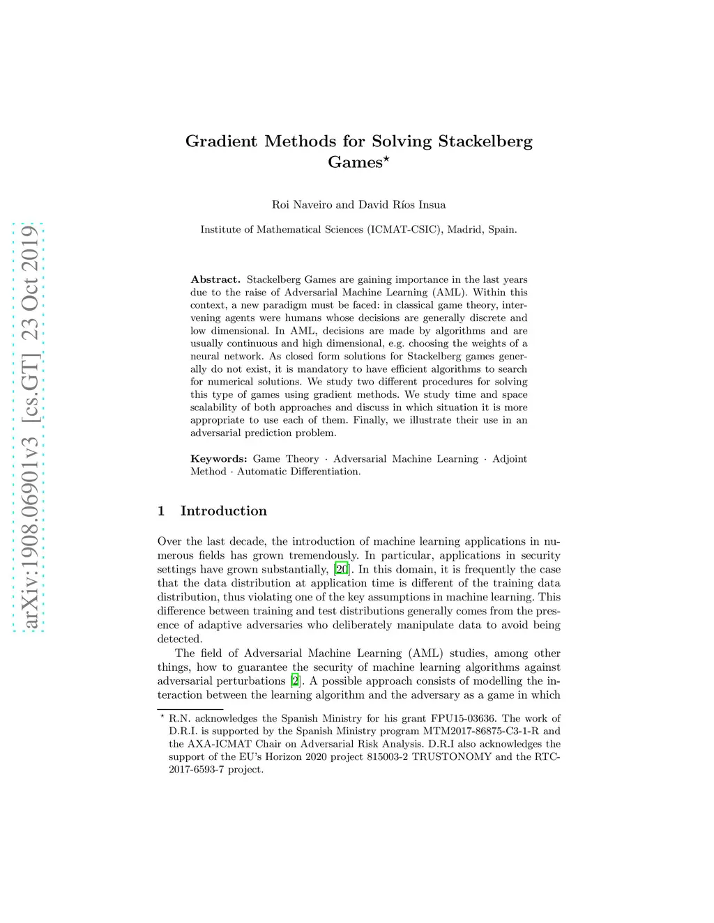 Stackelberg Games are gaining importance in the last years due to the raise of Adversarial Machine Learning (AML). Within this context, a new paradigm must be faced: in classical game theory, intervening agents were humans whose decisions are generally discrete and low dimensional. In AML, decisions are made by algorithms and are usually continuous and high dimensional, e.g. choosing the weights of a neural network. As closed form solutions for Stackelberg games generally do not exist, it is mandatory to have efficient algorithms to search for numerical solutions. We study two different procedures for solving this type of games using gradient methods. We study time and space scalability of both approaches and discuss in which situation it is more appropriate to use each of them. Finally, we illustrate their use in an adversarial prediction problem.