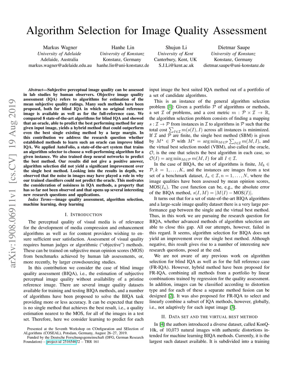 Subjective perceptual image quality can be assessed in lab studies by human observers. Objective image quality assessment (IQA) refers to algorithms for estimation of the mean subjective quality ratings. Many such methods have been proposed, both for blind IQA in which no original reference image is available as well as for the full-reference case. We compared 8 state-of-the-art algorithms for blind IQA and showed that an oracle, able to predict the best performing method for any given input image, yields a hybrid method that could outperform even the best single existing method by a large margin. In this contribution we address the research question whether established methods to learn such an oracle can improve blind IQA. We applied AutoFolio, a state-of-the-art system that trains an algorithm selector to choose a well-performing algorithm for a given instance. We also trained deep neural networks to predict the best method. Our results did not give a positive answer, algorithm selection did not yield a significant improvement over the single best method. Looking into the results in depth, we observed that the noise in images may have played a role in why our trained classifiers could not predict the oracle. This motivates the consideration of noisiness in IQA methods, a property that has so far not been observed and that opens up several interesting new research questions and applications.