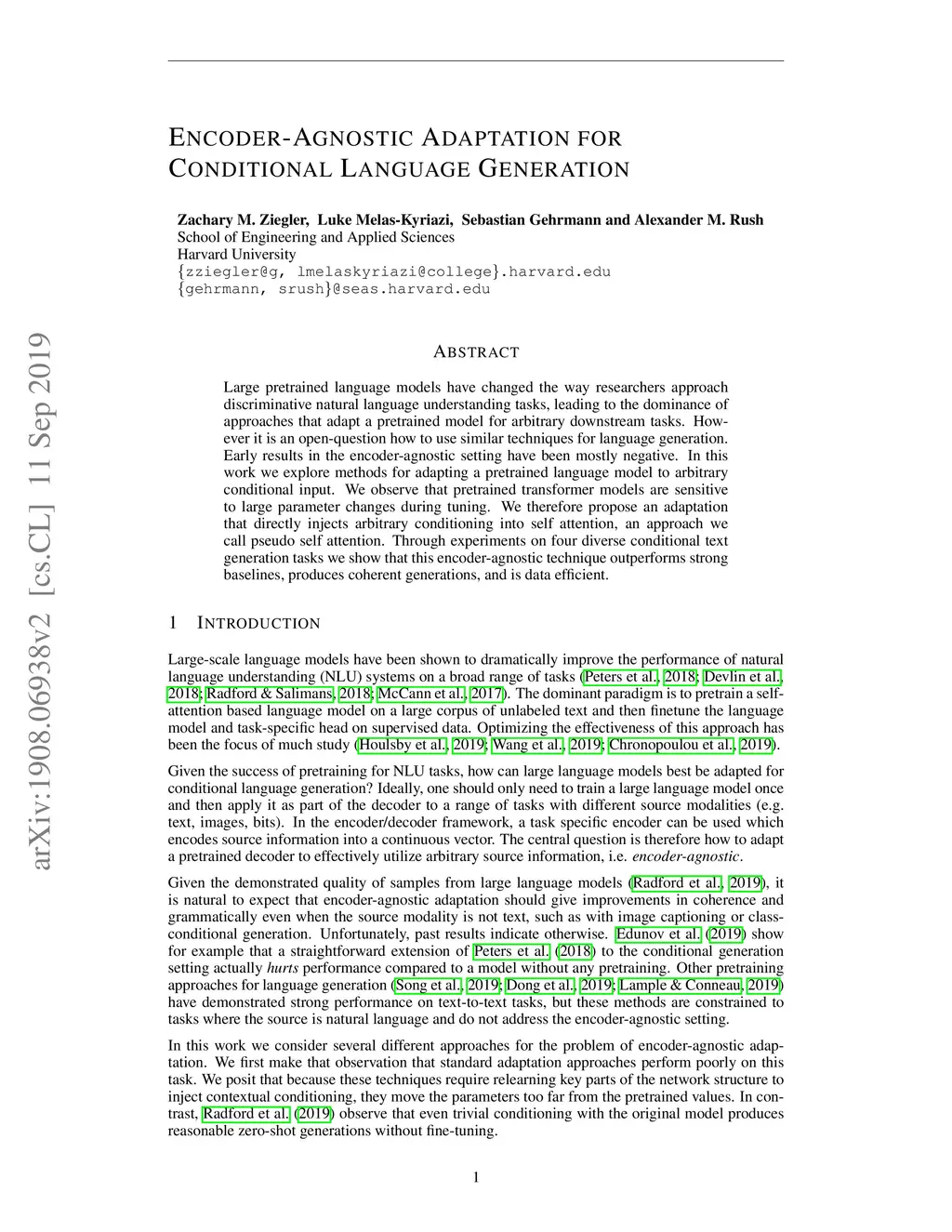 Large pretrained language models have changed the way researchers approach discriminative natural language understanding tasks, leading to the dominance of approaches that adapt a pretrained model for arbitrary downstream tasks. However it is an open-question how to use similar techniques for language generation. Early results in the encoder-agnostic setting have been mostly negative. In this work we explore methods for adapting a pretrained language model to arbitrary conditional input. We observe that pretrained transformer models are sensitive to large parameter changes during tuning. We therefore propose an adaptation that directly injects arbitrary conditioning into self attention, an approach we call pseudo self attention. Through experiments on four diverse conditional text generation tasks we show that this encoder-agnostic technique outperforms strong baselines, produces coherent generations, and is data efficient.