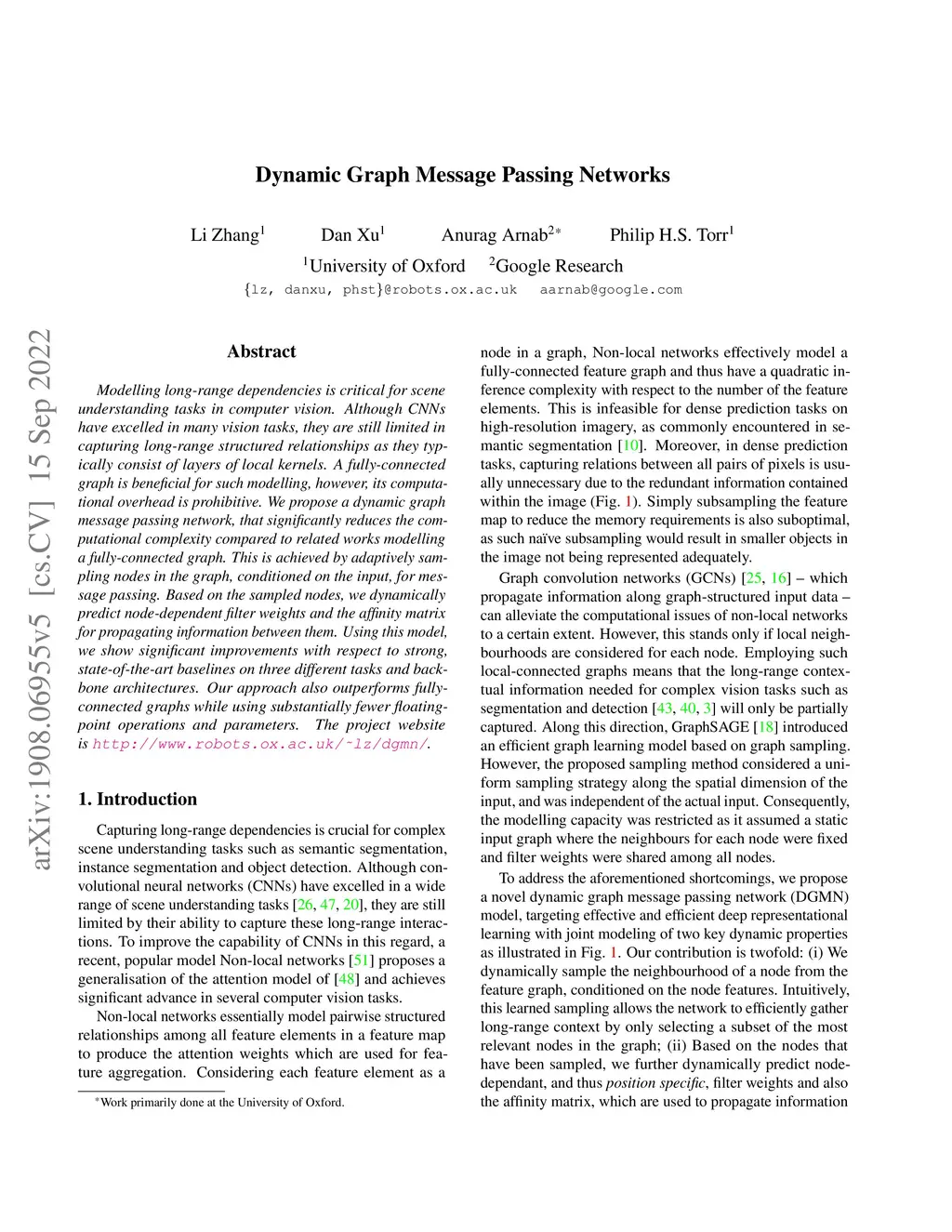 Modelling long-range dependencies is critical for scene understanding tasks in computer vision. Although CNNs have excelled in many vision tasks, they are still limited in capturing long-range structured relationships as they typically consist of layers of local kernels. A fully-connected graph is beneficial for such modelling, however, its computational overhead is prohibitive. We propose a dynamic graph message passing network, that significantly reduces the computational complexity compared to related works modelling a fully-connected graph. This is achieved by adaptively sampling nodes in the graph, conditioned on the input, for message passing. Based on the sampled nodes, we dynamically predict node-dependent filter weights and the affinity matrix for propagating information between them. Using this model, we show significant improvements with respect to strong, state-of-the-art baselines on three different tasks and backbone architectures. Our approach also outperforms fully-connected graphs while using substantially fewer floating-point operations and parameters. The project website is http://www.robots.ox.ac.uk/~lz/dgmn/