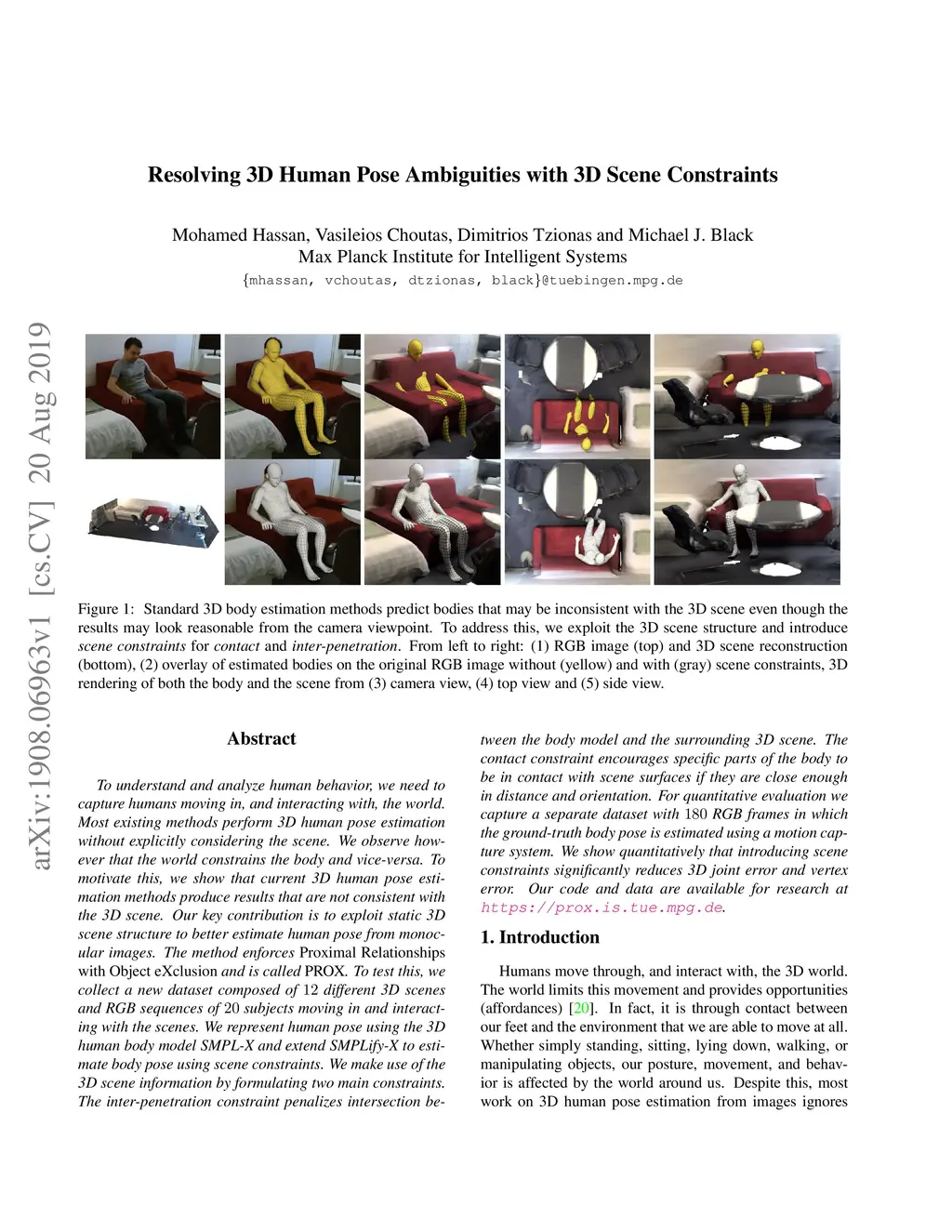 To understand and analyze human behavior, we need to capture humans moving in, and interacting with, the world. Most existing methods perform 3D human pose estimation without explicitly considering the scene. We observe however that the world constrains the body and vice-versa. To motivate this, we show that current 3D human pose estimation methods produce results that are not consistent with the 3D scene. Our key contribution is to exploit static 3D scene structure to better estimate human pose from monocular images. The method enforces Proximal Relationships with Object eXclusion and is called PROX. To test this, we collect a new dataset composed of 12 different 3D scenes and RGB sequences of 20 subjects moving in and interacting with the scenes. We represent human pose using the 3D human body model SMPL-X and extend SMPLify-X to estimate body pose using scene constraints. We make use of the 3D scene information by formulating two main constraints. The inter-penetration constraint penalizes intersection between the body model and the surrounding 3D scene. The contact constraint encourages specific parts of the body to be in contact with scene surfaces if they are close enough in distance and orientation. For quantitative evaluation we capture a separate dataset with 180 RGB frames in which the ground-truth body pose is estimated using a motion capture system. We show quantitatively that introducing scene constraints significantly reduces 3D joint error and vertex error. Our code and data are available for research at https://prox.is.tue.mpg.de.