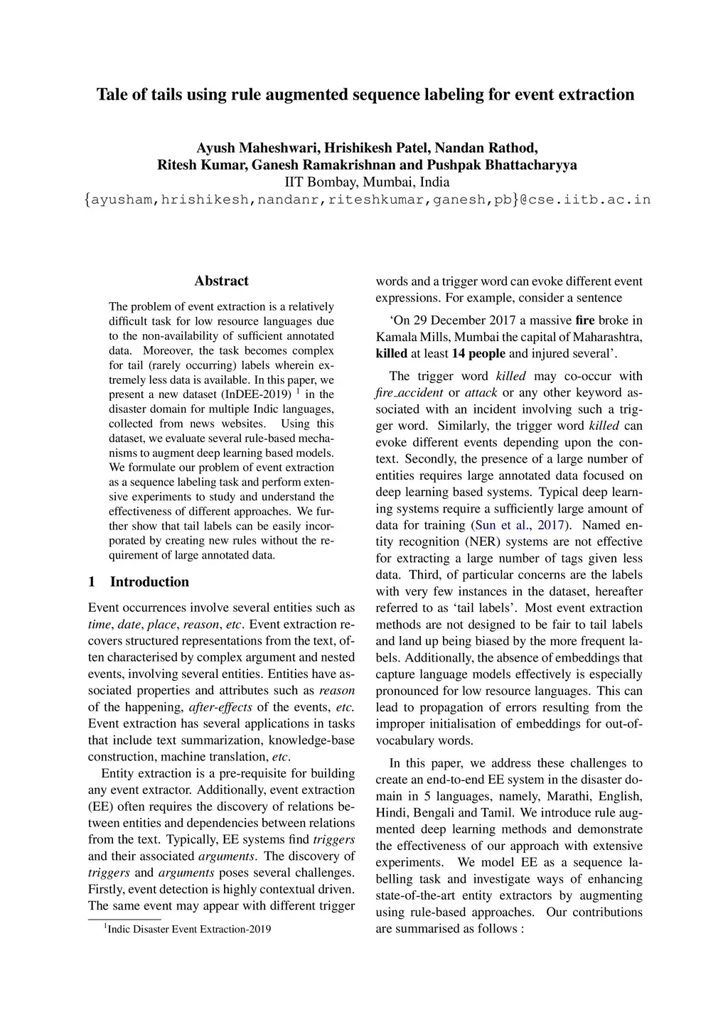 The problem of event extraction is a relatively difficult task for low resource languages due to the non-availability of sufficient annotated data. Moreover, the task becomes complex for tail (rarely occurring) labels wherein extremely less data is available. In this paper, we present a new dataset (InDEE-2019) in the disaster domain for multiple Indic languages, collected from news websites. Using this dataset, we evaluate several rule-based mechanisms to augment deep learning based models. We formulate our problem of event extraction as a sequence labeling task and perform extensive experiments to study and understand the effectiveness of different approaches. We further show that tail labels can be easily incorporated by creating new rules without the requirement of large annotated data.