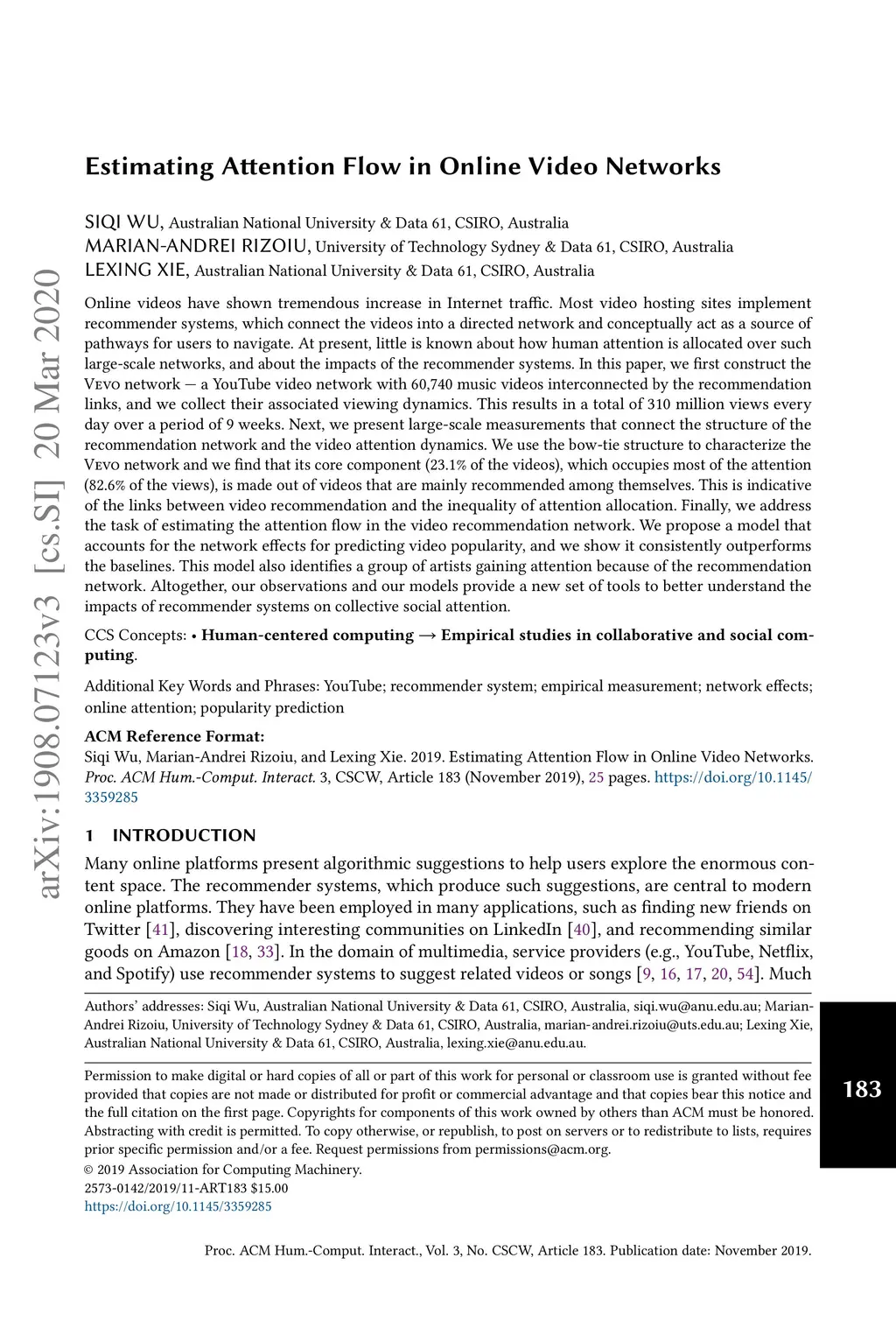 Online videos have shown tremendous increase in Internet traffic. Most video hosting sites implement recommender systems, which connect the videos into a directed network and conceptually act as a source of pathways for users to navigate. At present, little is known about how human attention is allocated over such large-scale networks, and about the impacts of the recommender systems. In this paper, we first construct the Vevo network -- a YouTube video network with 60,740 music videos interconnected by the recommendation links, and we collect their associated viewing dynamics. This results in a total of 310 million views every day over a period of 9 weeks. Next, we present large-scale measurements that connect the structure of the recommendation network and the video attention dynamics. We use the bow-tie structure to characterize the Vevo network and we find that its core component (23.1% of the videos), which occupies most of the attention (82.6% of the views), is made out of videos that are mainly recommended among themselves. This is indicative of the links between video recommendation and the inequality of attention allocation. Finally, we address the task of estimating the attention flow in the video recommendation network. We propose a model that accounts for the network effects for predicting video popularity, and we show it consistently outperforms the baselines. This model also identifies a group of artists gaining attention because of the recommendation network. Altogether, our observations and our models provide a new set of tools to better understand the impacts of recommender systems on collective social attention.