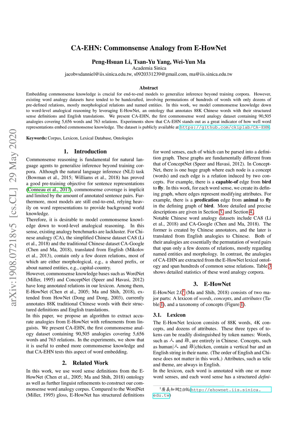 Embedding commonsense knowledge is crucial for end-to-end models to generalize inference beyond training corpora. However, existing word analogy datasets have tended to be handcrafted, involving permutations of hundreds of words with only dozens of pre-defined relations, mostly morphological relations and named entities. In this work, we model commonsense knowledge down to word-level analogical reasoning by leveraging E-HowNet, an ontology that annotates 88K Chinese words with their structured sense definitions and English translations. We present CA-EHN, the first commonsense word analogy dataset containing 90,505 analogies covering 5,656 words and 763 relations. Experiments show that CA-EHN stands out as a great indicator of how well word representations embed commonsense knowledge. The dataset is publicly available at https://github.com/ckiplab/CA-EHN.