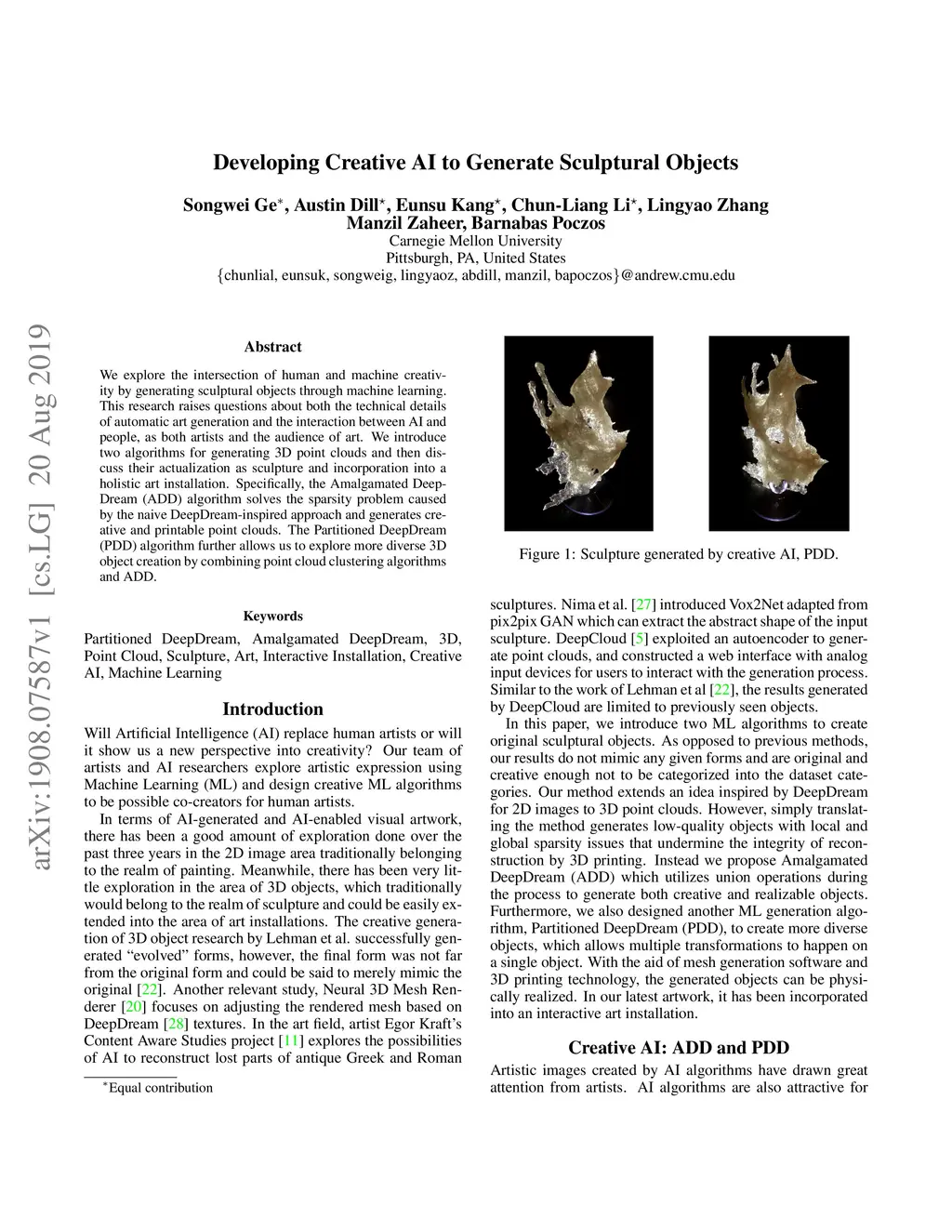 We explore the intersection of human and machine creativity by generating sculptural objects through machine learning. This research raises questions about both the technical details of automatic art generation and the interaction between AI and people, as both artists and the audience of art. We introduce two algorithms for generating 3D point clouds and then discuss their actualization as sculpture and incorporation into a holistic art installation. Specifically, the Amalgamated DeepDream (ADD) algorithm solves the sparsity problem caused by the naive DeepDream-inspired approach and generates creative and printable point clouds. The Partitioned DeepDream (PDD) algorithm further allows us to explore more diverse 3D object creation by combining point cloud clustering algorithms and ADD.