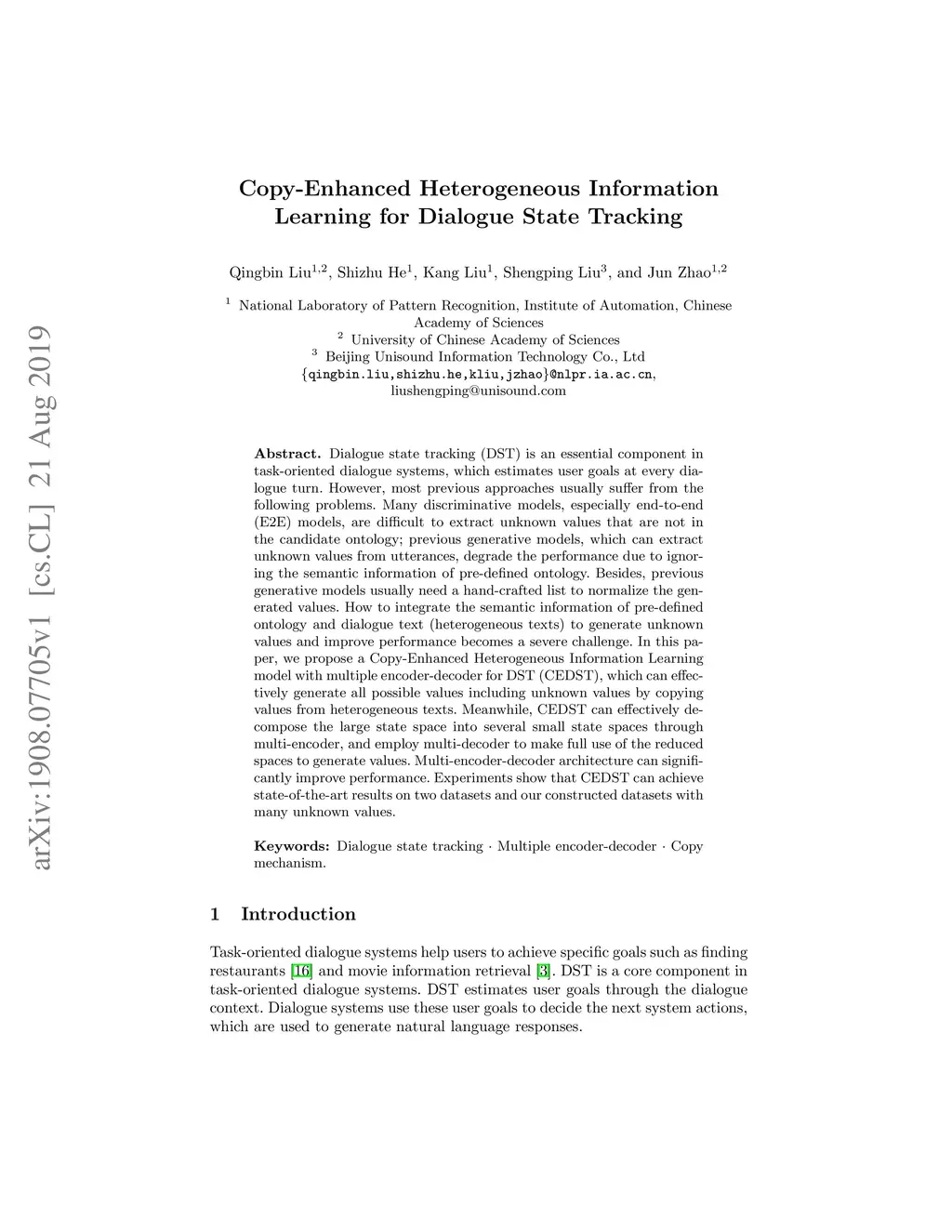 Dialogue state tracking (DST) is an essential component in task-oriented dialogue systems, which estimates user goals at every dialogue turn. However, most previous approaches usually suffer from the following problems. Many discriminative models, especially end-to-end (E2E) models, are difficult to extract unknown values that are not in the candidate ontology; previous generative models, which can extract unknown values from utterances, degrade the performance due to ignoring the semantic information of pre-defined ontology. Besides, previous generative models usually need a hand-crafted list to normalize the generated values. How to integrate the semantic information of pre-defined ontology and dialogue text (heterogeneous texts) to generate unknown values and improve performance becomes a severe challenge. In this paper, we propose a Copy-Enhanced Heterogeneous Information Learning model with multiple encoder-decoder for DST (CEDST), which can effectively generate all possible values including unknown values by copying values from heterogeneous texts. Meanwhile, CEDST can effectively decompose the large state space into several small state spaces through multi-encoder, and employ multi-decoder to make full use of the reduced spaces to generate values. Multi-encoder-decoder architecture can significantly improve performance. Experiments show that CEDST can achieve state-of-the-art results on two datasets and our constructed datasets with many unknown values.