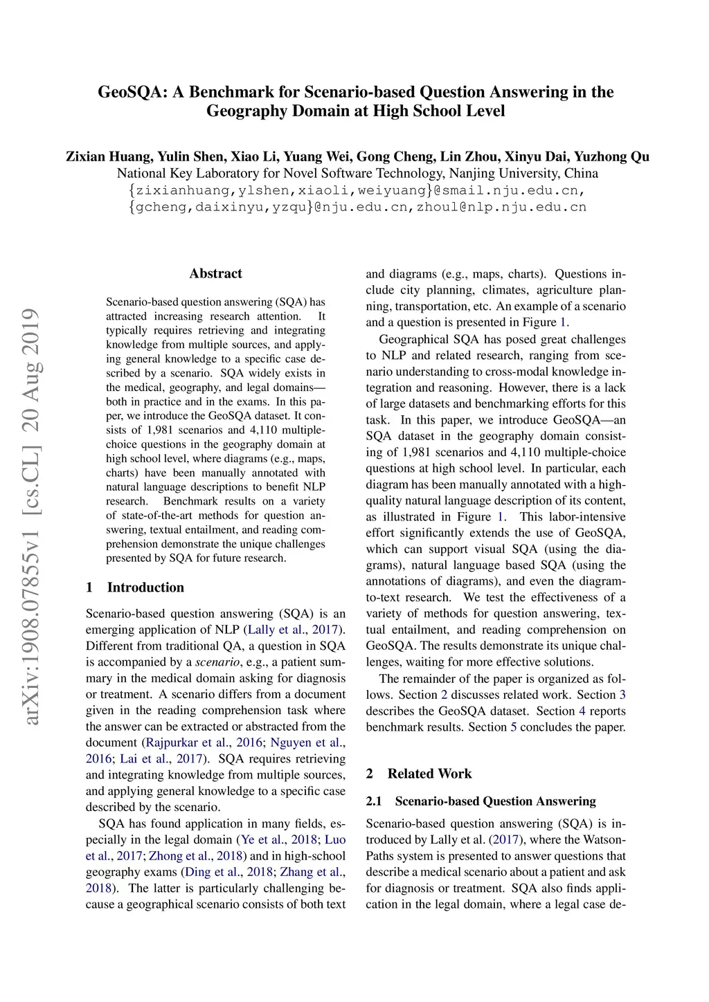 Scenario-based question answering (SQA) has attracted increasing research attention. It typically requires retrieving and integrating knowledge from multiple sources, and applying general knowledge to a specific case described by a scenario. SQA widely exists in the medical, geography, and legal domains---both in practice and in the exams. In this paper, we introduce the GeoSQA dataset. It consists of 1,981 scenarios and 4,110 multiple-choice questions in the geography domain at high school level, where diagrams (e.g., maps, charts) have been manually annotated with natural language descriptions to benefit NLP research. Benchmark results on a variety of state-of-the-art methods for question answering, textual entailment, and reading comprehension demonstrate the unique challenges presented by SQA for future research.
