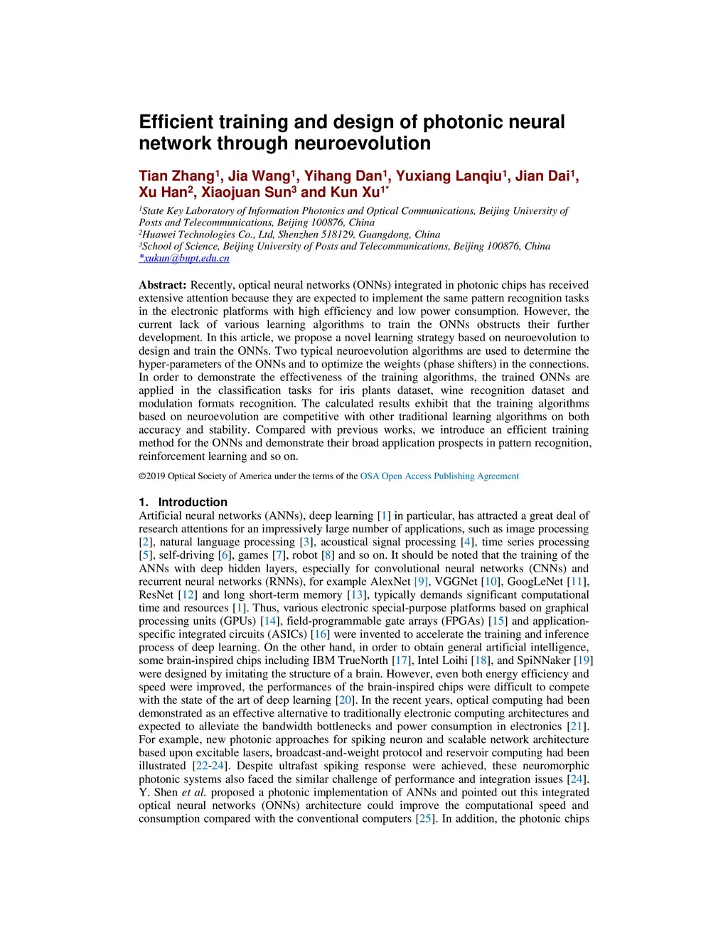 Recently, optical neural networks (ONNs) integrated in photonic chips has received extensive attention because they are expected to implement the same pattern recognition tasks in the electronic platforms with high efficiency and low power consumption. However, the current lack of various learning algorithms to train the ONNs obstructs their further development. In this article, we propose a novel learning strategy based on neuroevolution to design and train the ONNs. Two typical neuroevolution algorithms are used to determine the hyper-parameters of the ONNs and to optimize the weights (phase shifters) in the connections. In order to demonstrate the effectiveness of the training algorithms, the trained ONNs are applied in the classification tasks for iris plants dataset, wine recognition dataset and modulation formats recognition. The calculated results exhibit that the training algorithms based on neuroevolution are competitive with other traditional learning algorithms on both accuracy and stability. Compared with previous works, we introduce an efficient training method for the ONNs and demonstrate their broad application prospects in pattern recognition, reinforcement learning and so on.