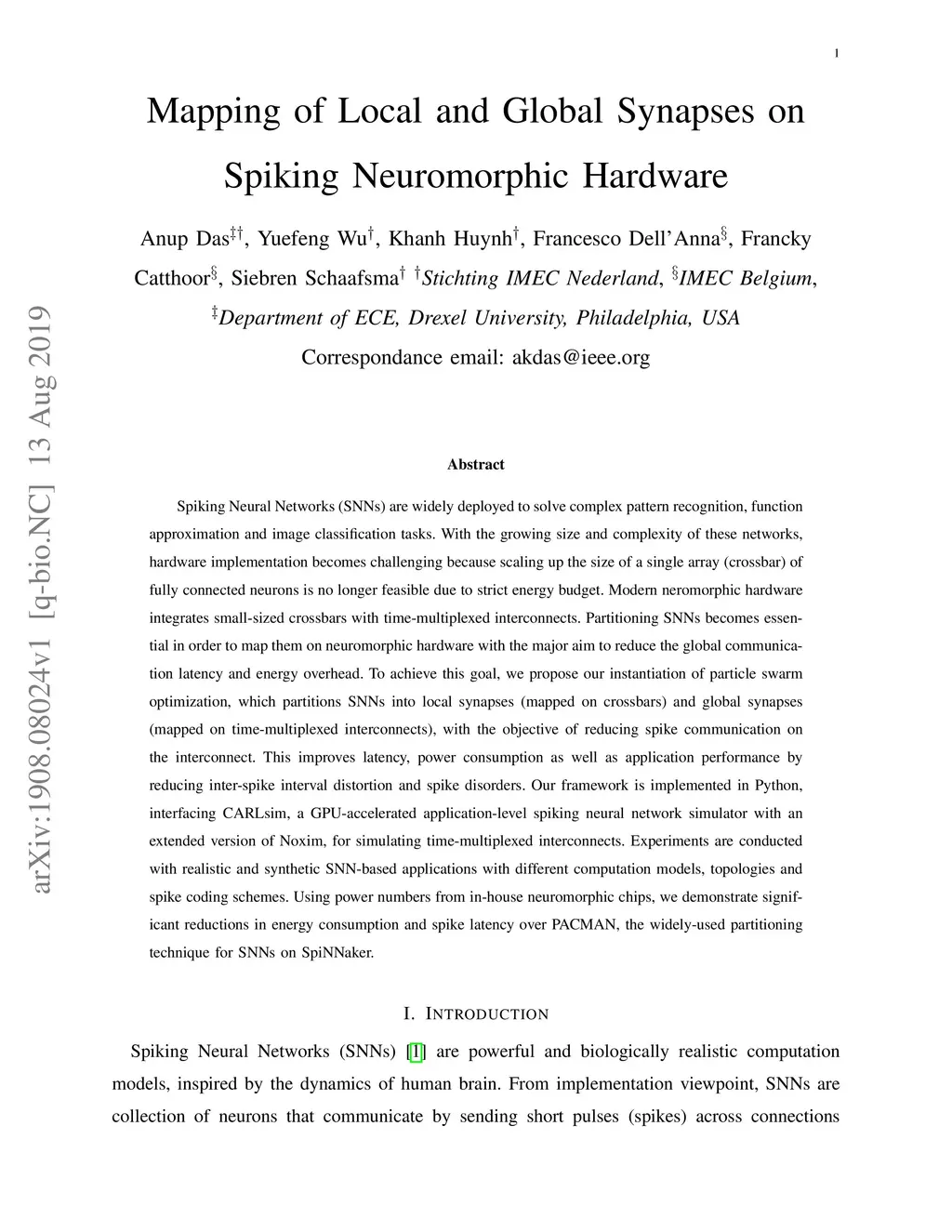 Spiking Neural Networks (SNNs) are widely deployed to solve complex pattern recognition, function approximation and image classification tasks. With the growing size and complexity of these networks, hardware implementation becomes challenging because scaling up the size of a single array (crossbar) of fully connected neurons is no longer feasible due to strict energy budget. Modern neromorphic hardware integrates small-sized crossbars with time-multiplexed interconnects. Partitioning SNNs becomes essential in order to map them on neuromorphic hardware with the major aim to reduce the global communication latency and energy overhead. To achieve this goal, we propose our instantiation of particle swarm optimization, which partitions SNNs into local synapses (mapped on crossbars) and global synapses (mapped on time-multiplexed interconnects), with the objective of reducing spike communication on the interconnect. This improves latency, power consumption as well as application performance by reducing inter-spike interval distortion and spike disorders. Our framework is implemented in Python, interfacing CARLsim, a GPU-accelerated application-level spiking neural network simulator with an extended version of Noxim, for simulating time-multiplexed interconnects. Experiments are conducted with realistic and synthetic SNN-based applications with different computation models, topologies and spike coding schemes. Using power numbers from in-house neuromorphic chips, we demonstrate significant reductions in energy consumption and spike latency over PACMAN, the widely-used partitioning technique for SNNs on SpiNNaker.