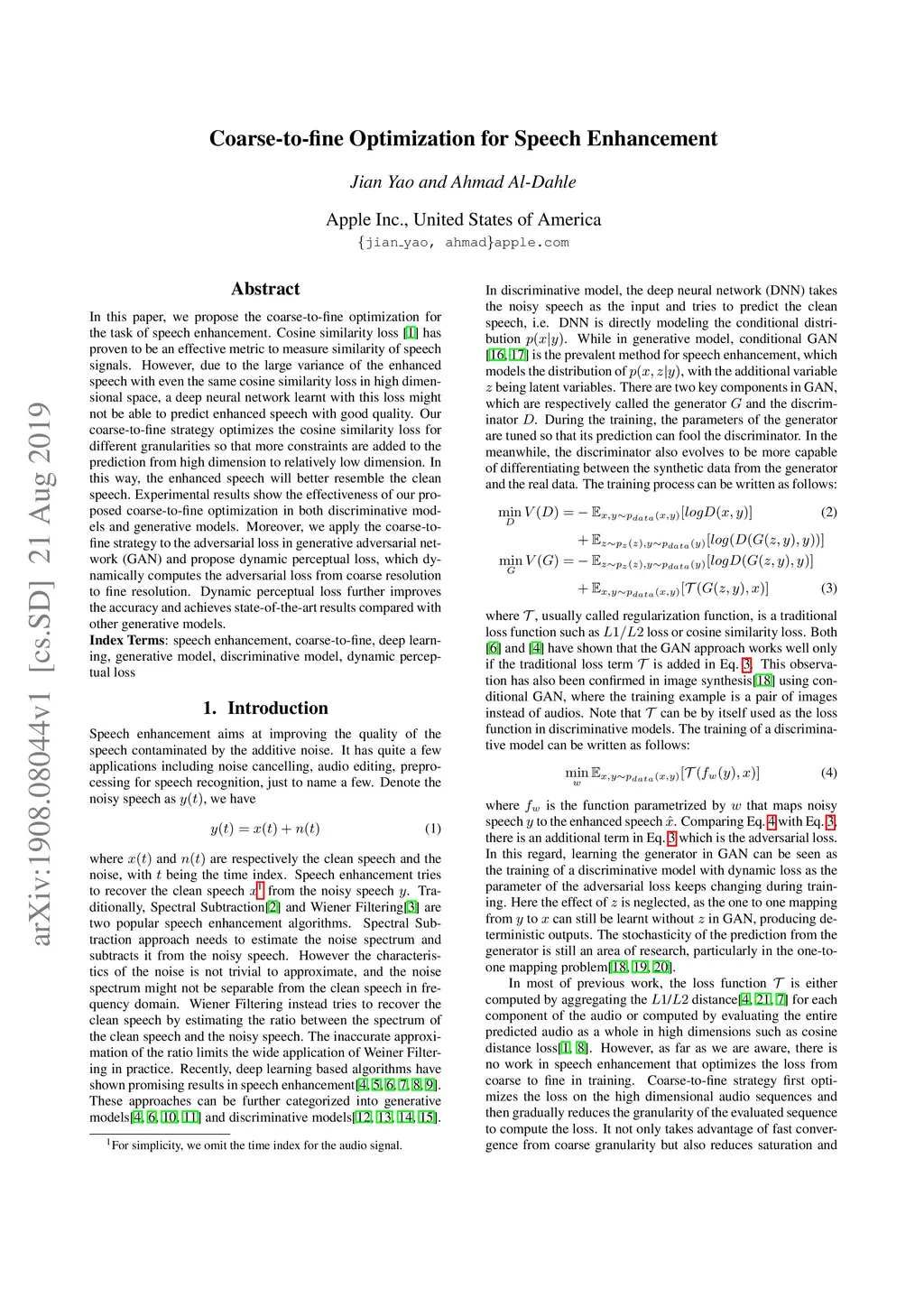 In this paper, we propose the coarse-to-fine optimization for the task of speech enhancement. Cosine similarity loss [1] has proven to be an effective metric to measure similarity of speech signals. However, due to the large variance of the enhanced speech with even the same cosine similarity loss in high dimensional space, a deep neural network learnt with this loss might not be able to predict enhanced speech with good quality. Our coarse-to-fine strategy optimizes the cosine similarity loss for different granularities so that more constraints are added to the prediction from high dimension to relatively low dimension. In this way, the enhanced speech will better resemble the clean speech. Experimental results show the effectiveness of our proposed coarse-to-fine optimization in both discriminative models and generative models. Moreover, we apply the coarse-to-fine strategy to the adversarial loss in generative adversarial network (GAN) and propose dynamic perceptual loss, which dynamically computes the adversarial loss from coarse resolution to fine resolution. Dynamic perceptual loss further improves the accuracy and achieves state-of-the-art results compared with other generative models.