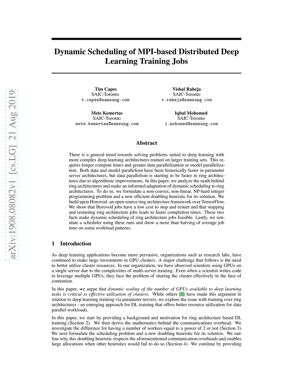 There is a general trend towards solving problems suited to deep learning with more complex deep learning architectures trained on larger training sets. This requires longer compute times and greater data parallelization or model parallelization. Both data and model parallelism have been historically faster in parameter server architectures, but data parallelism is starting to be faster in ring architectures due to algorithmic improvements. In this paper, we analyze the math behind ring architectures and make an informed adaptation of dynamic scheduling to ring architectures. To do so, we formulate a non-convex, non-linear, NP-hard integer programming problem and a new efficient doubling heuristic for its solution. We build upon Horovod: an open source ring architecture framework over TensorFlow. We show that Horovod jobs have a low cost to stop and restart and that stopping and restarting ring architecture jobs leads to faster completion times. These two facts make dynamic scheduling of ring architecture jobs feasible. Lastly, we simulate a scheduler using these runs and show a more than halving of average job time on some workload patterns.