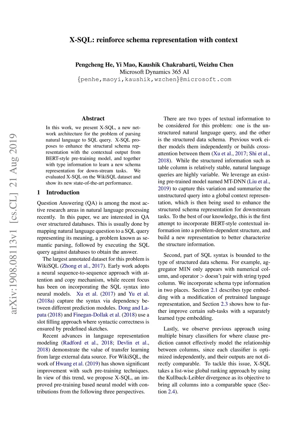 In this work, we present X-SQL, a new network architecture for the problem of parsing natural language to SQL query. X-SQL proposes to enhance the structural schema representation with the contextual output from BERT-style pre-training model, and together with type information to learn a new schema representation for down-stream tasks. We evaluated X-SQL on the WikiSQL dataset and show its new state-of-the-art performance.