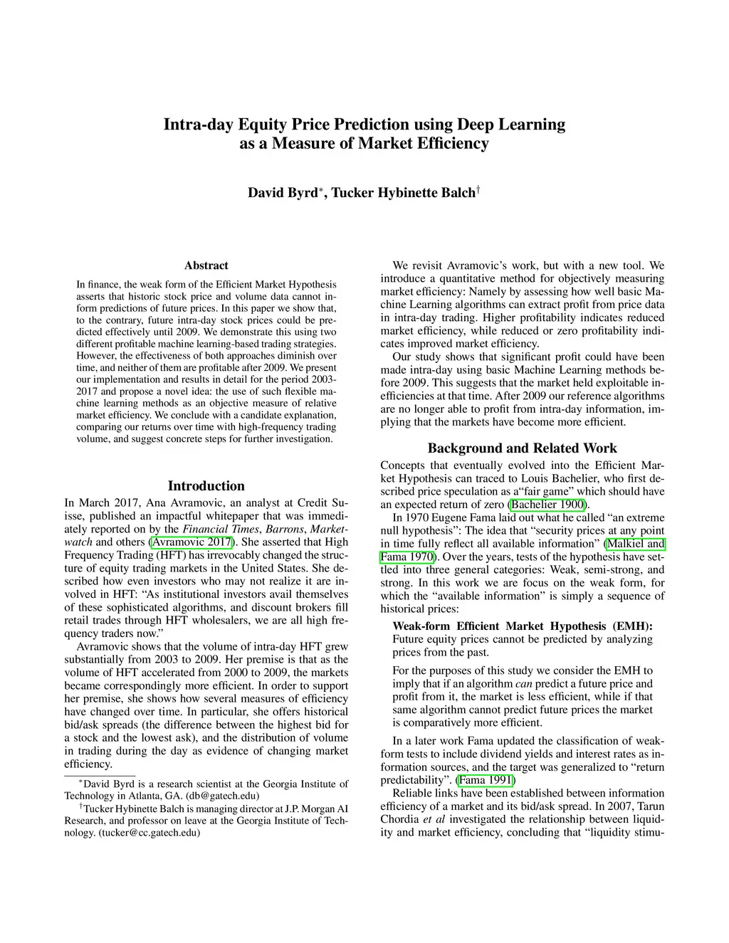 In finance, the weak form of the Efficient Market Hypothesis asserts that historic stock price and volume data cannot inform predictions of future prices. In this paper we show that, to the contrary, future intra-day stock prices could be predicted effectively until 2009. We demonstrate this using two different profitable machine learning-based trading strategies. However, the effectiveness of both approaches diminish over time, and neither of them are profitable after 2009. We present our implementation and results in detail for the period 2003-2017 and propose a novel idea: the use of such flexible machine learning methods as an objective measure of relative market efficiency. We conclude with a candidate explanation, comparing our returns over time with high-frequency trading volume, and suggest concrete steps for further investigation.