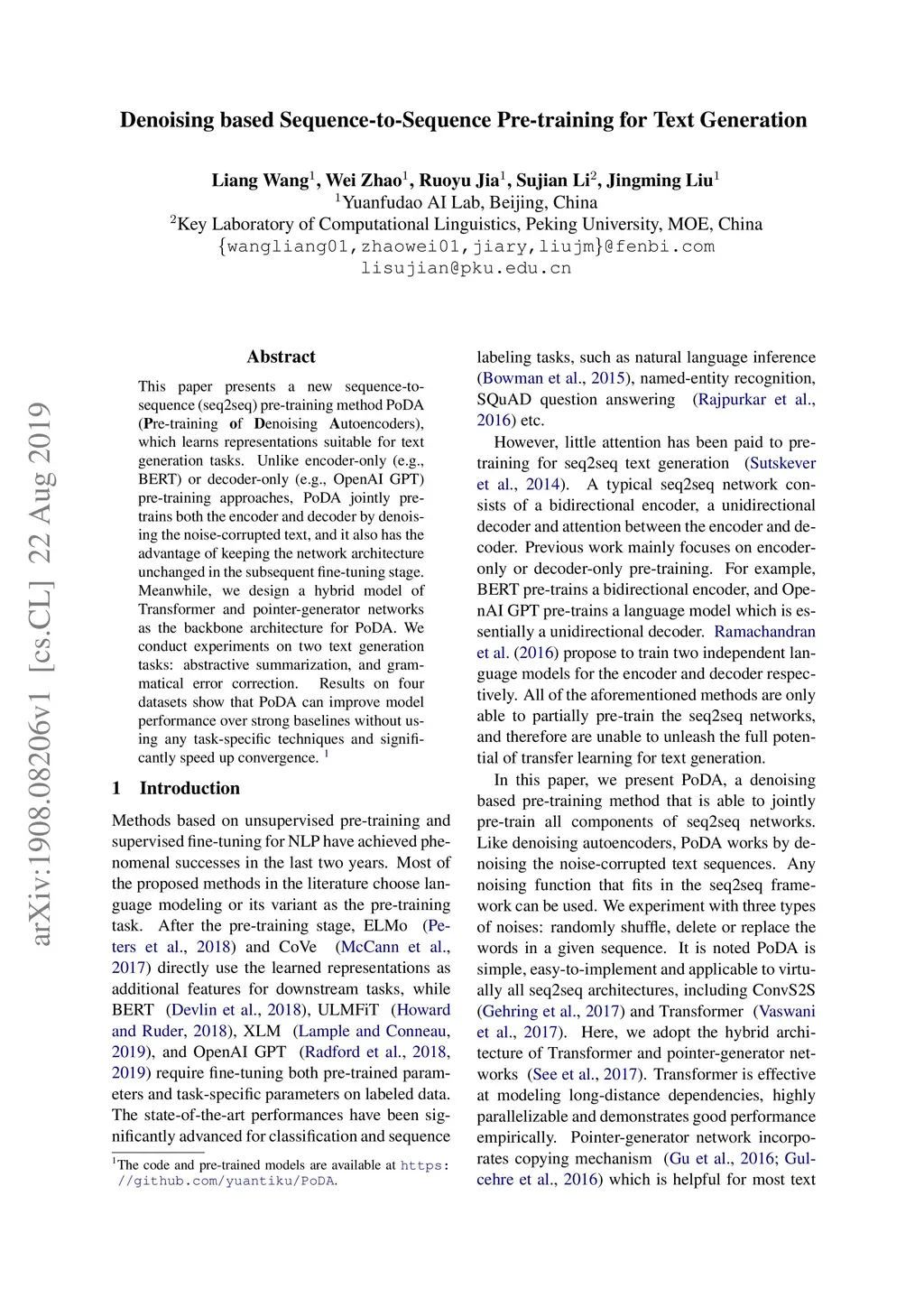 This paper presents a new sequence-to-sequence (seq2seq) pre-training method PoDA (Pre-training of Denoising Autoencoders), which learns representations suitable for text generation tasks. Unlike encoder-only (e.g., BERT) or decoder-only (e.g., OpenAI GPT) pre-training approaches, PoDA jointly pre-trains both the encoder and decoder by denoising the noise-corrupted text, and it also has the advantage of keeping the network architecture unchanged in the subsequent fine-tuning stage. Meanwhile, we design a hybrid model of Transformer and pointer-generator networks as the backbone architecture for PoDA. We conduct experiments on two text generation tasks: abstractive summarization, and grammatical error correction. Results on four datasets show that PoDA can improve model performance over strong baselines without using any task-specific techniques and significantly speed up convergence.
